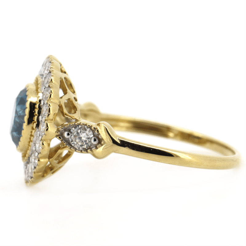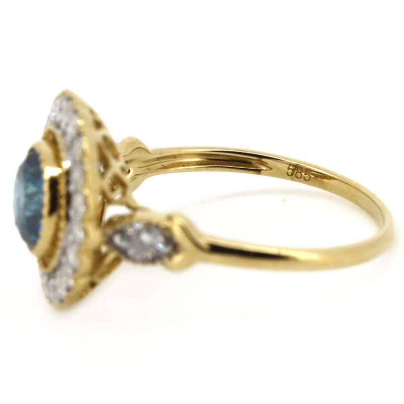 14K YELLOW GOLD, FANCY BLUE DIAMOND, VINTAGE INSPIRED RING.