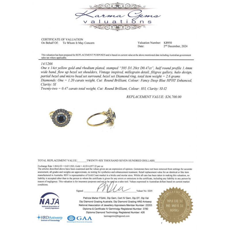 The Centre Features, One Round Brilliant Cut, Fancy Deep Blue, Diamond (1.20Ct, Si Clarity), Bezel Set. Surrounding The Centre In A Halo And Decorating The Band Are, 22 Round Brilliant Cut, Diamonds (0.47Ct Tdw, H-I Colour, Si-I2 Clarity), Bead Set With Millegrain Detail. Ring Size N.