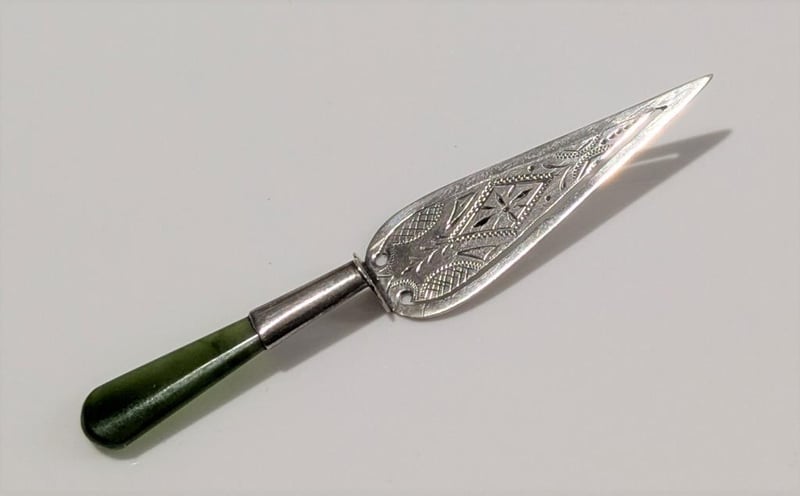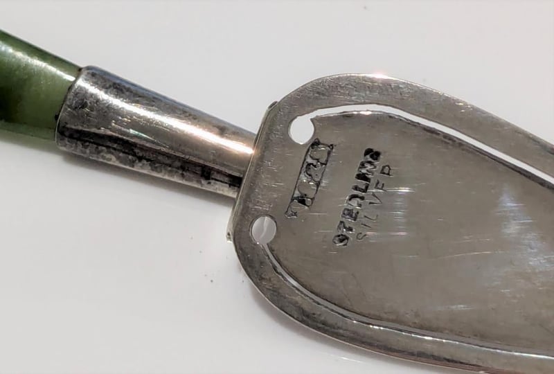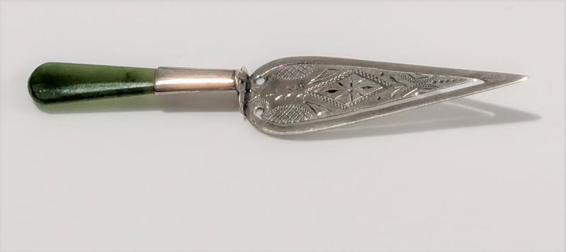 ANTIQUE STERLING SILVER & NZ JADE TROWEL BOOK MARK OR PAGE MARKER, MAKERS MARK & "STERLING SILVER" ON BASE OF PIECE