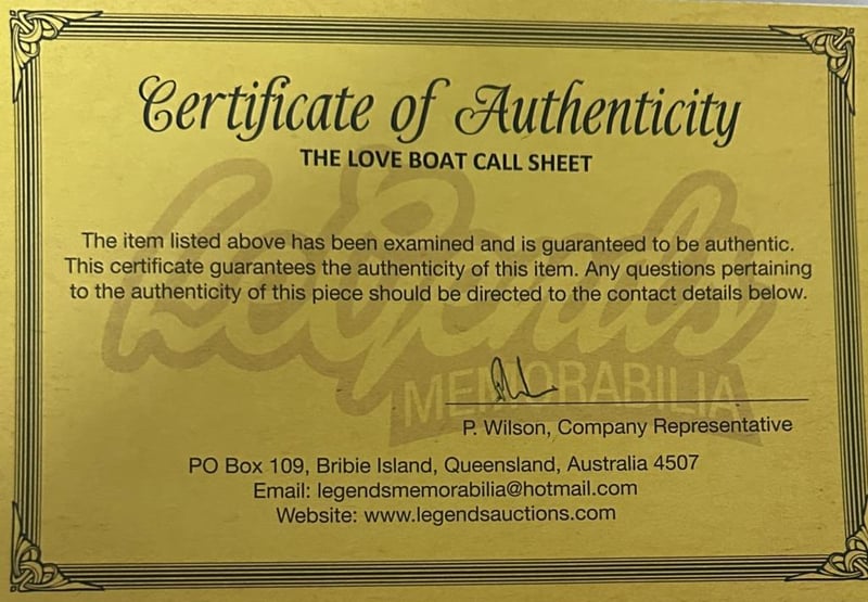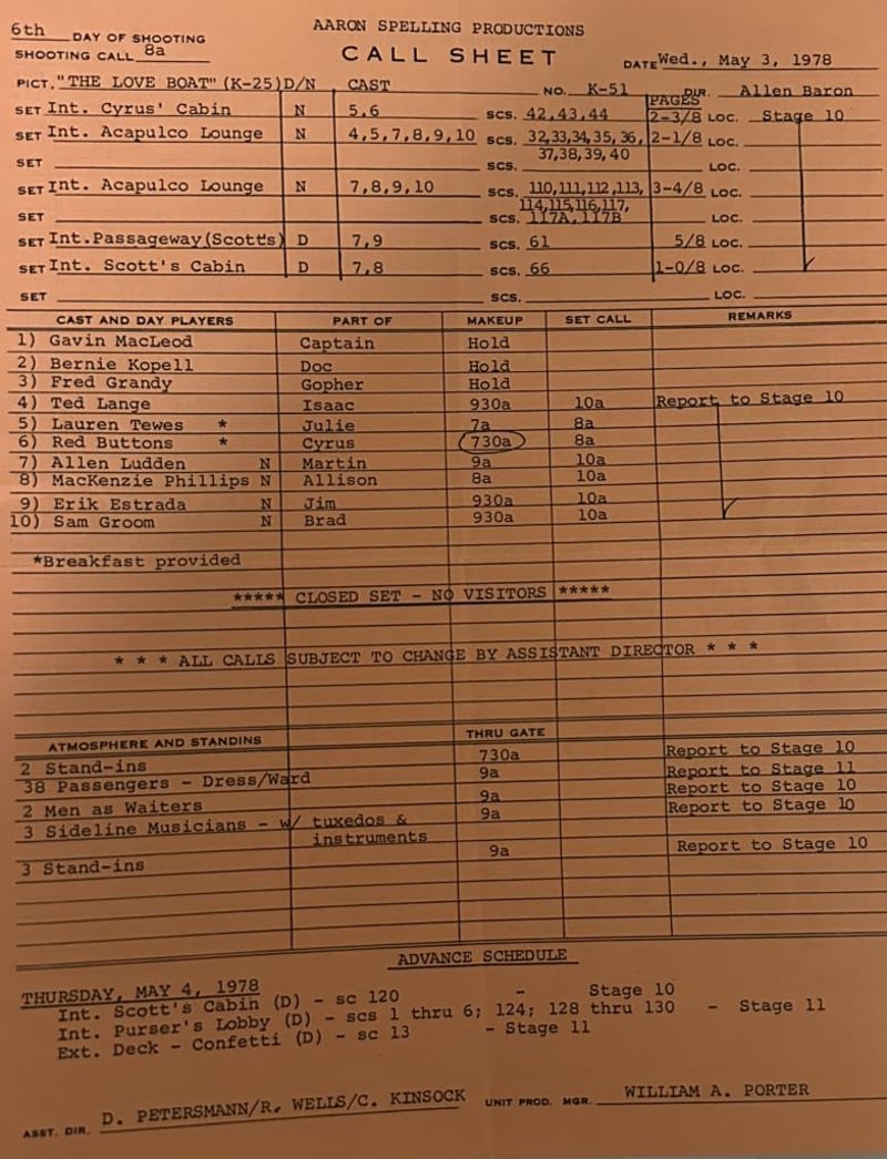 THE LOVE BOAT TV FILMING 1978 CALL SHEET The Love Boat Call Sheet From An Episode Filmed In 1978. The Love Boat Was A Cult Comedy Television Series Filmed During The Late1970'S And 1980'S. . The Item Is Accompanied By A Certificate Of Authenticity. Condition: Good - Refer To Images 584906+44