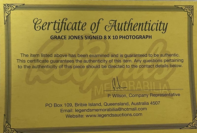 GRACE JONES SIGNED PHOTO Grace Jones Personally Signed 8 X 10 Photo. Grace Jones Is A Jamaican Singer, Songwriter, Model And Actress. She Began Her Modelling Career In New York State. The Item Is Accompanied By A Certificate Of Authenticity. Condition: Good - Refer To Images 584906+51