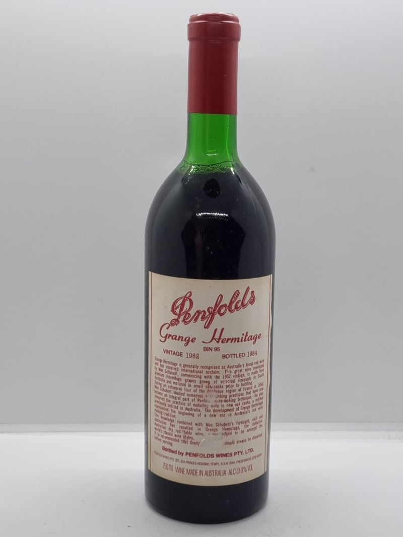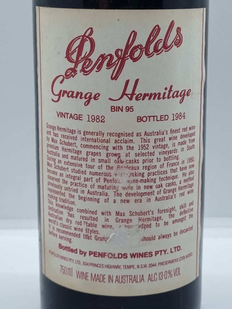 PENFOLDS GRANGE HERMITAGE BIN 95 , VINTAGE 1982, Bottled 1984 750mL COLOUR Very deep, rich brick red. NOSE Very ripe, sweet plum jam aromas. Vanilla and mint characters with a hint of leafiness. PALATE Masses of delicious super-fleshy fruit throughout, very elegant and supple but undeniably a fullbodied wine with an assertive tannin finish.