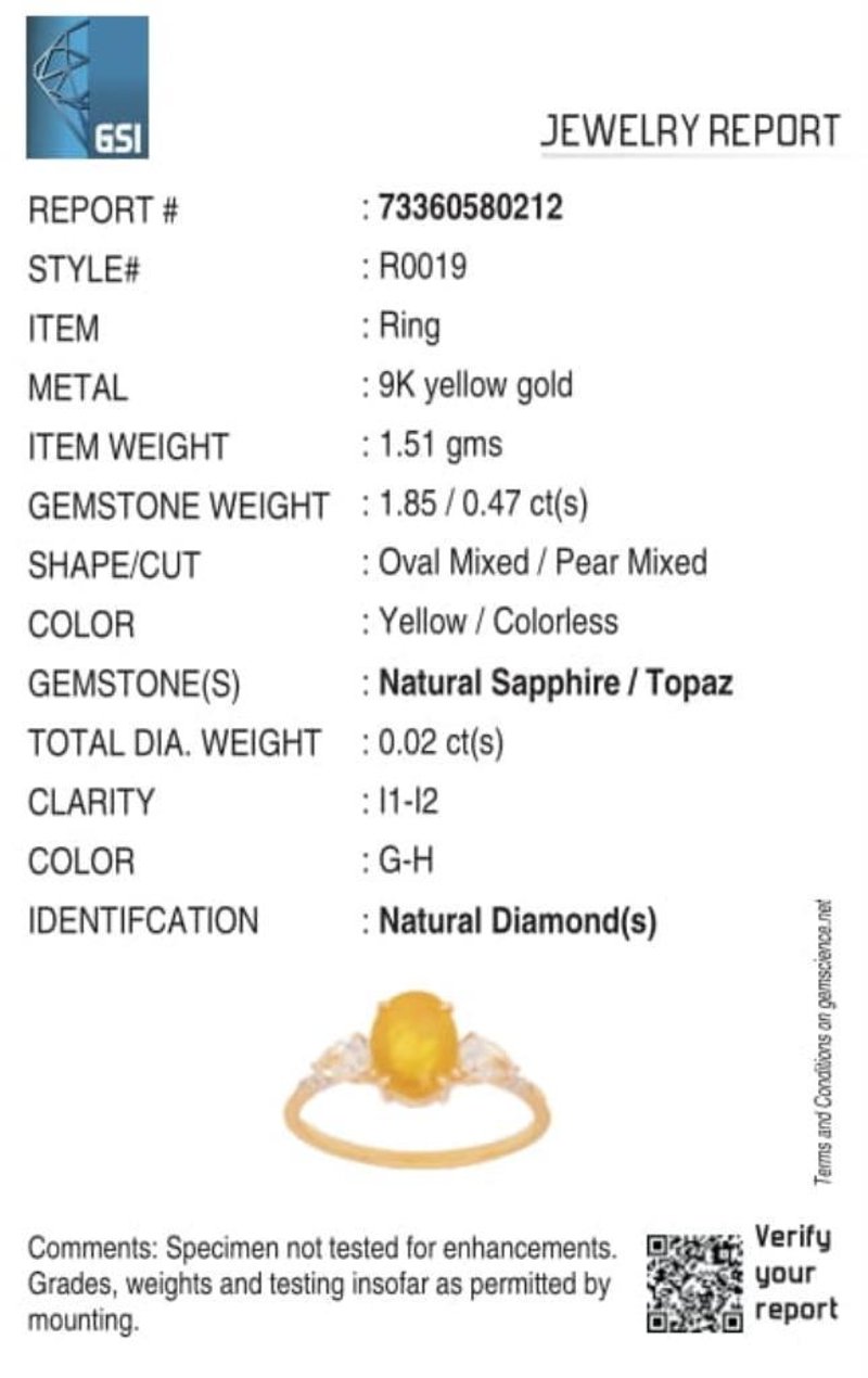 9CT YELLOW GOLD NATURAL 9CT YELLOW SAPPHIRE / NATURAL WHITE TOPAZ & DIAMOND RING Weight Of The Item: 1.51 GFineness Of Metal(S): Yellow Gold 9KtThe Ring Consists Of (1) Oval Brilliant Natural Yellow Sapphire & (2) Pear Brilliant Cut White Topaz. Surrounding The Main Stones Are Round Brilliant Cut Natural Diamonds.Antique StyleIdentification: Natural Yellow Sapphire / Natural White TopazColor: Yellow / WhiteShape: Oval Brilliant Cut / Pear Faceted CutNo. Of Stone: 3Dimension: 8 Mm X 6 Mm X 4.8 MmWeight: 1.85 Carats / 0.47 CaratsCut: Very GoodIdentification: Natural DiamondShape: Round Brilliant CutWeight: 0.02 CtsCut: Excellent. Certificates Are Provided By Gemological Science International (Gsi), An Independent Third-Party Gemological Laboratory Based In The Usa And Recognised Among The Top 10 Gem Labs Globally Condition: Good - Refer Images 0488266+44