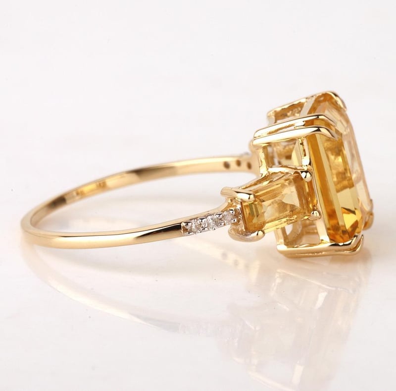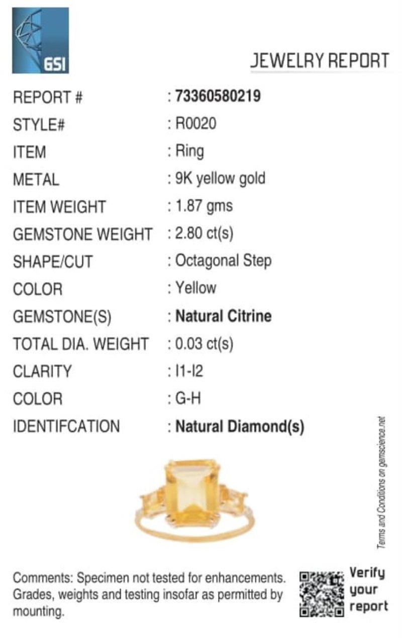 9CT YELLOW GOLD NATURAL CITRINE / NATURAL CITRINE & DIAMOND RING Weight Of The Item: 1.87 GFineness Of Metal(S): Yellow Gold 9KtThe Ring Consists Of (1) Octagon Brilliant Natural Citrine & (2) Octagon Step Cut Citrine. Surrounding The Main Stones Are Round Brilliant Cut Natural Diamonds.Antique StyleIdentification: Natural Citrine / Natural CitrineColor: Yellow / YellowShape: Octagon Brilliant Cut / Octagon Faceted CutNo. Of Stone: 3Dimension: 10 Mm X 8 Mm X 6 MmWeight: 2.8 Carats / 0 CaratsCut: Very GoodIdentification: Natural DiamondShape: Round Brilliant CutWeight: 0.03 CtsCut: Excellent. Certificates Are Provided By Gemological Science International (Gsi), An Independent Third-Party Gemological Laboratory Based In The Usa And Recognised Among The Top 10 Gem Labs Globally Condition: Good - Refer Images 0488266+47