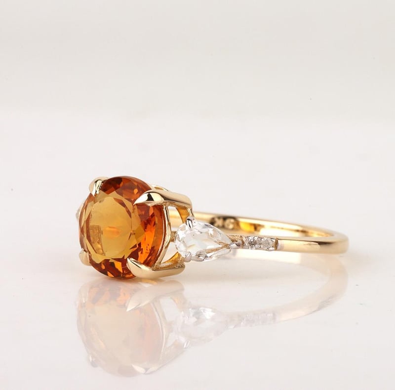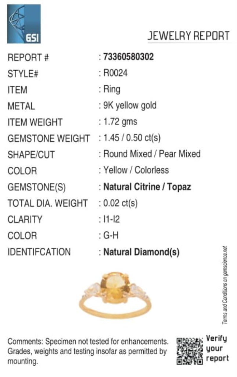 9CT YELLOW GOLD NATURAL CITRINE / NATURAL WHITE TOPAZ & DIAMOND RING Weight Of The Item: 1.72 GFineness Of Metal(S): Yellow Gold 9KtThe Ring Consists Of (1) Round Brilliant Natural Citrine & (2) Pear Brilliant Cut White Topaz. Surrounding The Main Stones Are Round Brilliant Cut Natural Diamonds.Antique StyleIdentification: Natural Citrine / Natural White TopazColor: Yellow / WhiteShape: Round Brilliant Cut / Pear Faceted CutNo. Of Stone: 3Dimension: 8 Mm X 8 Mm X 4.8 MmWeight: 1.45 Carats / 0.5 CaratsCut: Very GoodIdentification: Natural DiamondShape: Round Brilliant CutWeight: 0.02 CtsCut: Excellent. Certificates Are Provided By Gemological Science International (Gsi), An Independent Third-Party Gemological Laboratory Based In The Usa And Recognised Among The Top 10 Gem Labs Globally Condition: Good - Refer Images 0488266+55