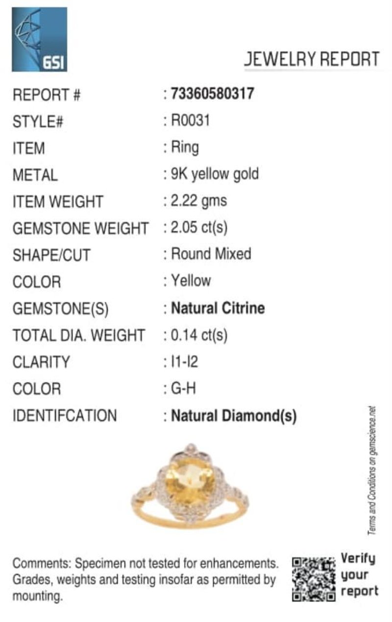 9CT YELLOW GOLD NATURAL CITRINE & DIAMOND RING Weight Of The Item: 2.22 GFineness Of Metal(S): Yellow Gold 9KtThe Ring Consists Of (1) Round Brilliant Natural Citrine. Surrounding The Main Stones Are Round Brilliant Cut Natural Diamonds.Antique StyleIdentification: Natural CitrineColor: YellowShape: Round Brilliant CutNo. Of Stone: 1Dimension: 8 Mm X 8 Mm X 4.8 MmWeight: 2.05 CaratsCut: Very GoodIdentification: Natural DiamondShape: Round Brilliant CutWeight: 0.14 CtsCut: Excellent. Certificates Are Provided By Gemological Science International (Gsi), An Independent Third-Party Gemological Laboratory Based In The Usa And Recognised Among The Top 10 Gem Labs Globally Condition: Good - Refer Images 0488266+70
