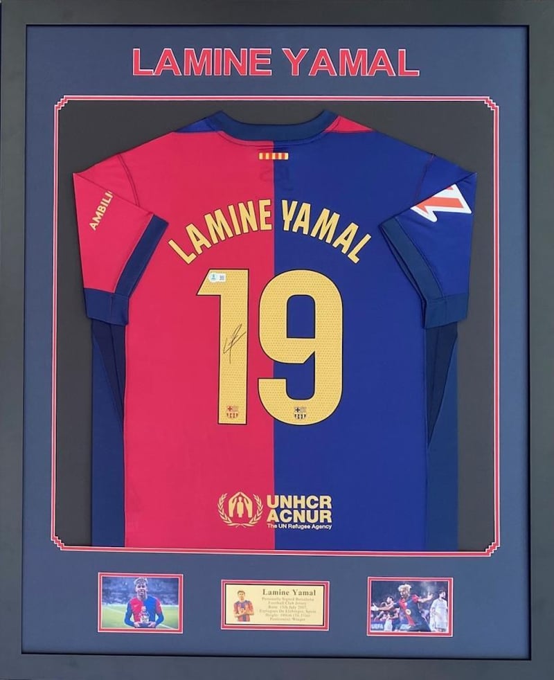 LAMINE YAMAL PERSONALLY SIGNED BARCELONA FOOTBALL CLUB JERSEY Framed Using Double Mats, 2 Unsigned Photographs And A Plaque. Hand Signed By Lamine Yamal Using A Black MarkerAccompanied By A Certificate Of Authenticity From BeckettCondition: Good - Refer To Images488263+11