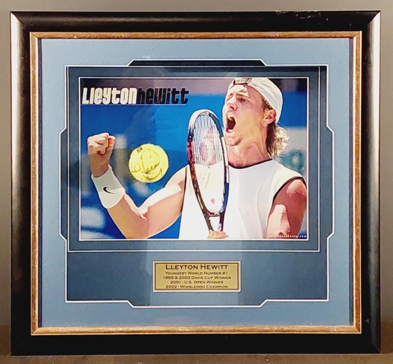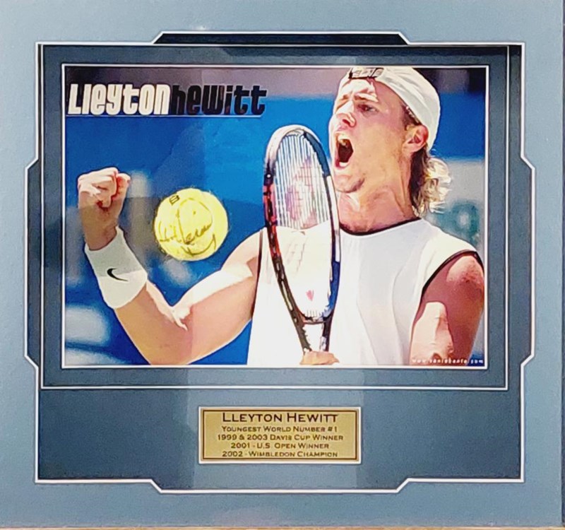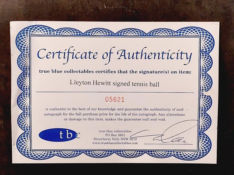 LLEYTON HEWITT HANDSIGNED TENNIS BALL IN FRAMED DISPLAY Comes With Certificate Of Authenticity From True Blue Collectables Size: 57cm x 62cm x 11cm Condition: Excellent - Refer To Images 155566+5