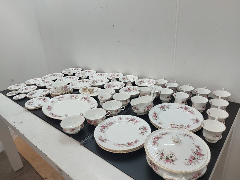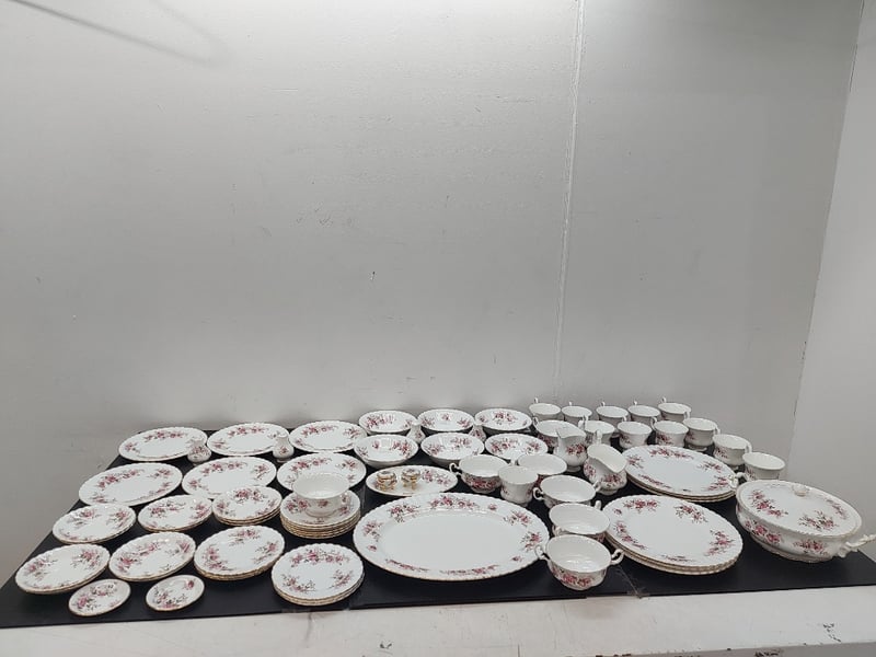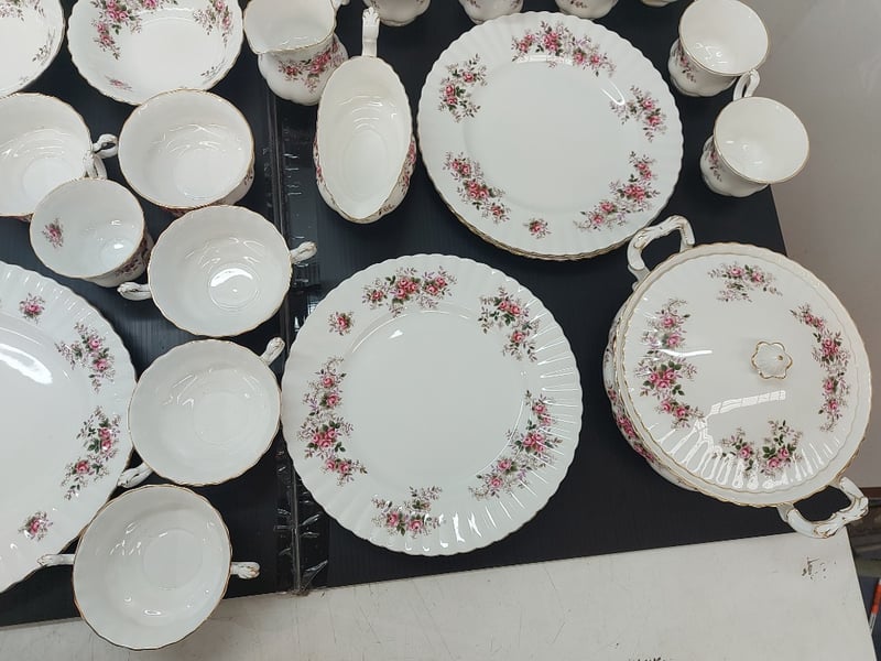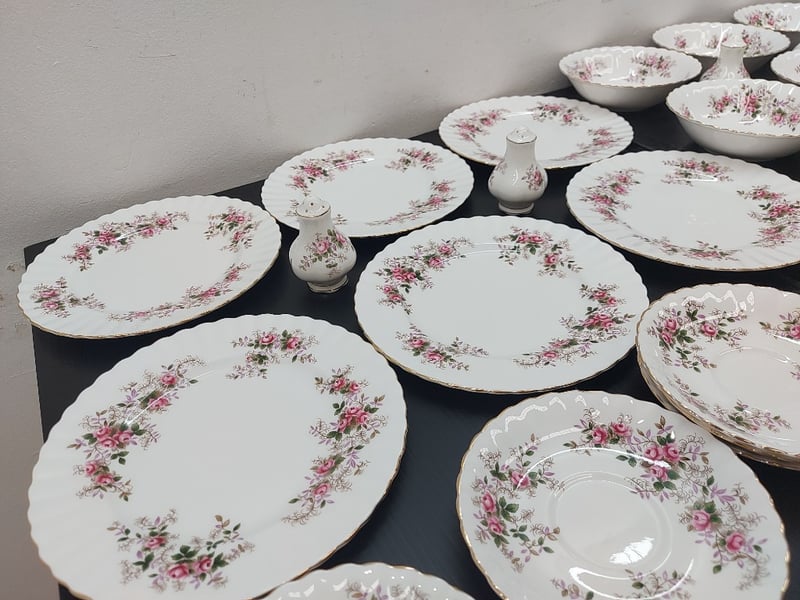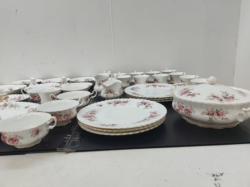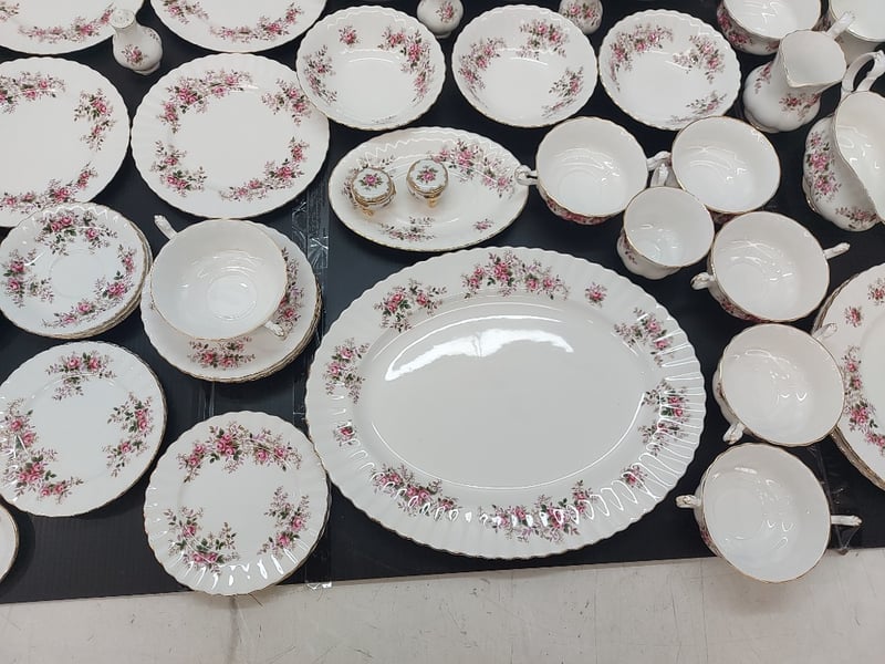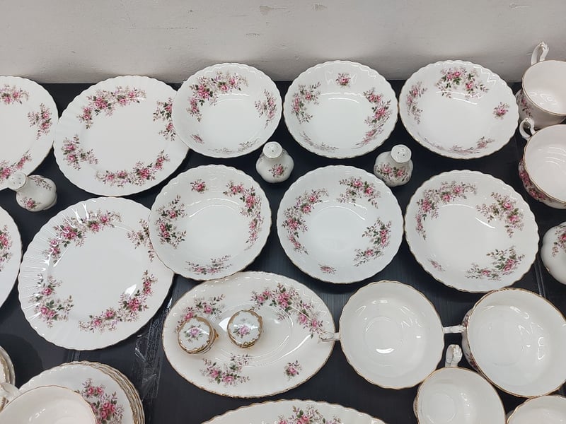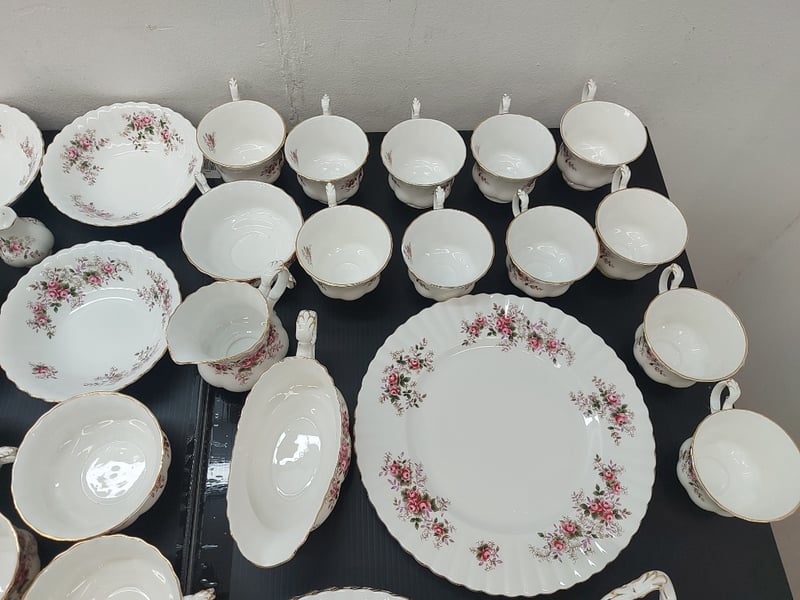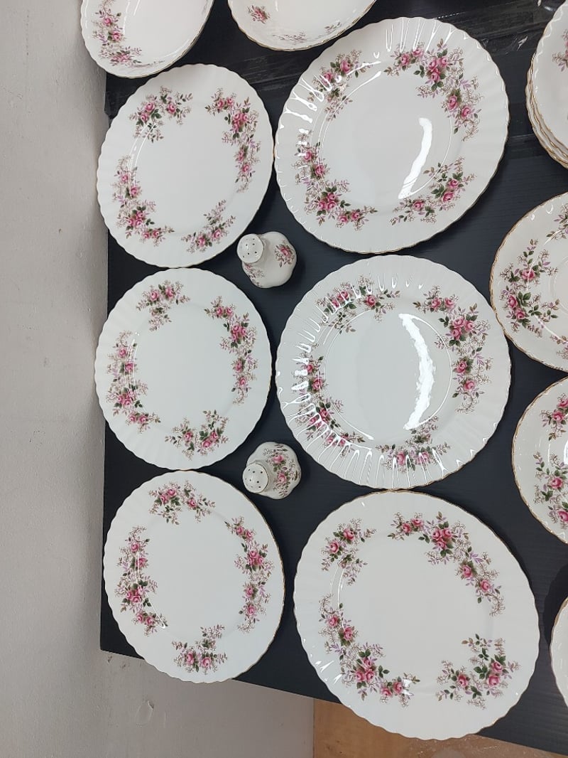 ROYAL ALBERT, BONE CHINA ENGLAND, LAVENDER ROSE, DINNER SET, INCLUDES CUPS DISHES, SERVING PLATE, SALT AND PEPPER SHAKERS, BOWLS, LARGE AND SMALL PLATES,