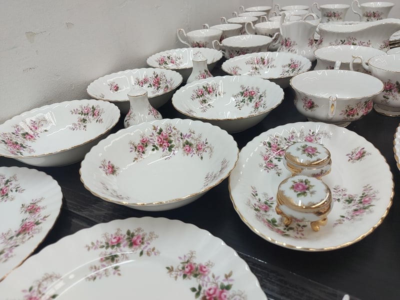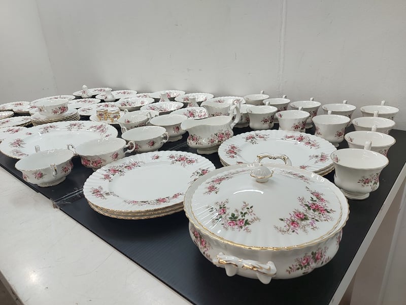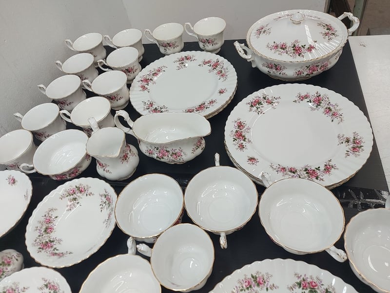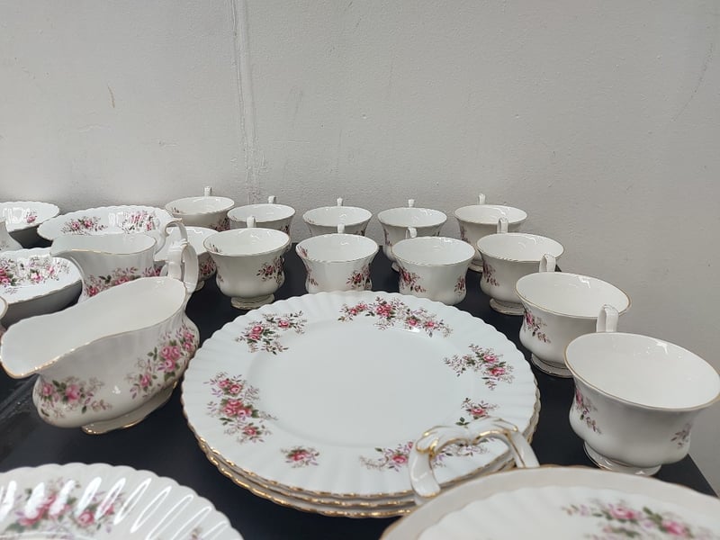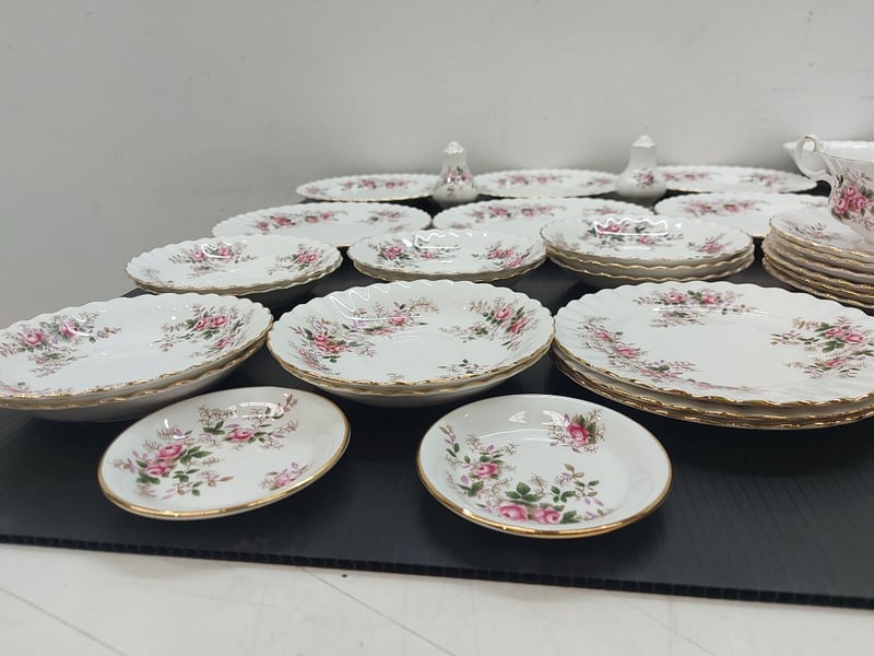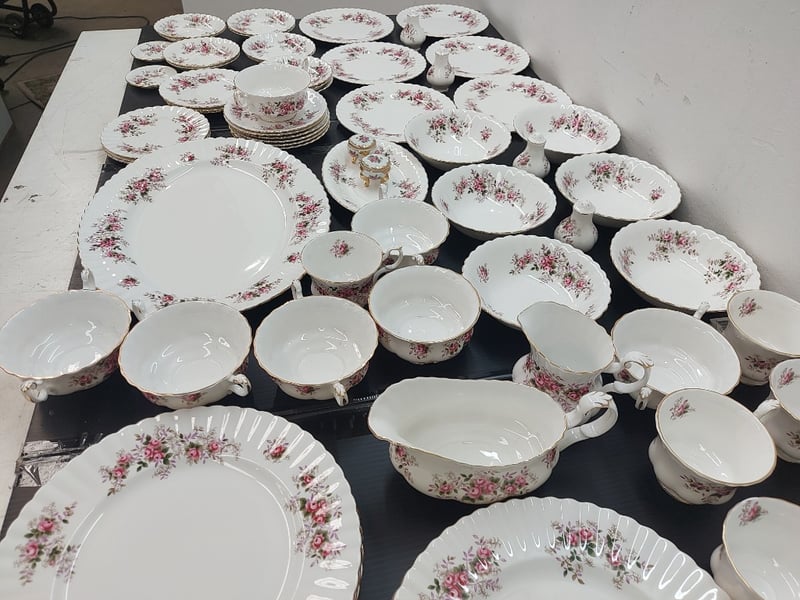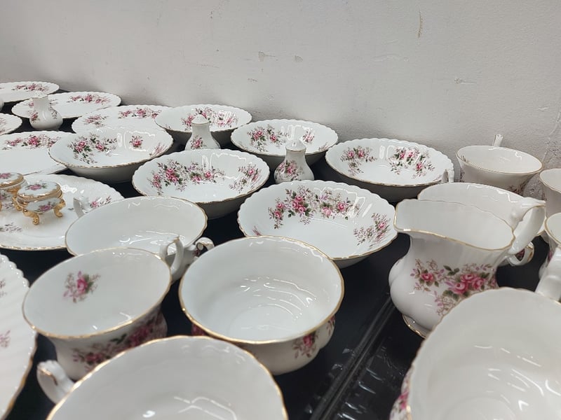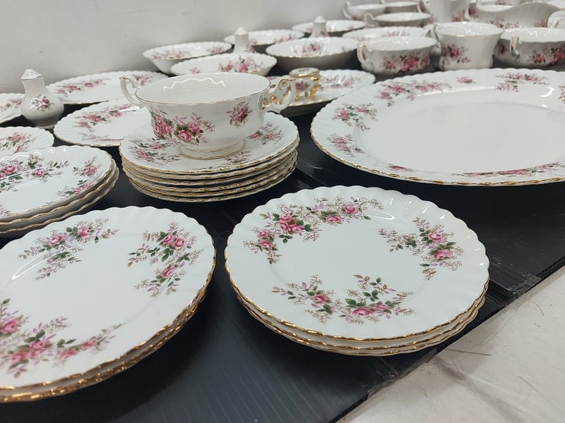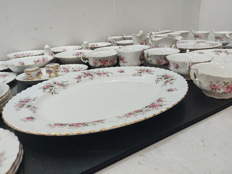 ROYAL ALBERT, BONE CHINA ENGLAND, LAVENDER ROSE, DINNER SET, INCLUDES CUPS DISHES, SERVING PLATE, SALT AND PEPPER SHAKERS, BOWLS, LARGE AND SMALL PLATES,