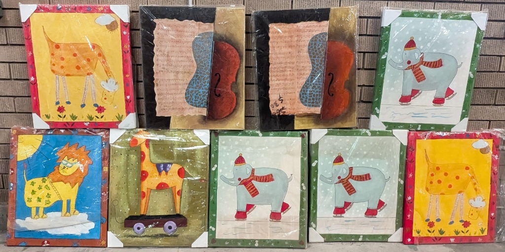 NINE OIL ON CANVAS ARTWORKSItem Size: Height: 60cm, Width: 50cmArtworks Feature Animal And Music ThemeArtworks Stretched And Ready To HangCondition: Good - Refer To Images584844+28