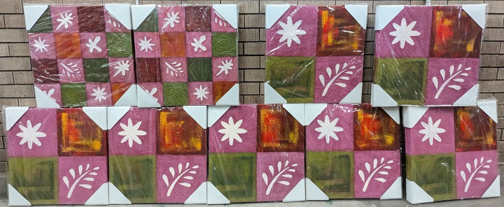 NINE OIL PAINT ON CANVAS ARTWORKSItem Size: Height: 60cm, Width: 60cmArtworks Feature Square Designs With Floral Style Imagery,Artworks Stretched And Ready To HangCondition: Good - Refer To Images584844+32