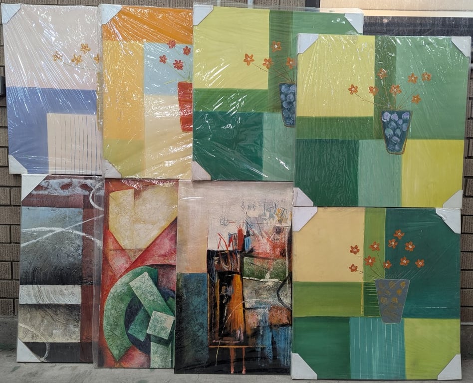 EIGHT OIL PAINTING ON CANVAS ARTWORKSVarious Artwork Themes Including Flowers In Vases And Abstract ShapesArtwork Sizes Include: 70X70Cm & 80X80CmArtworks Stretched And Ready To HangCondition: Good - Refer To Images584844+63