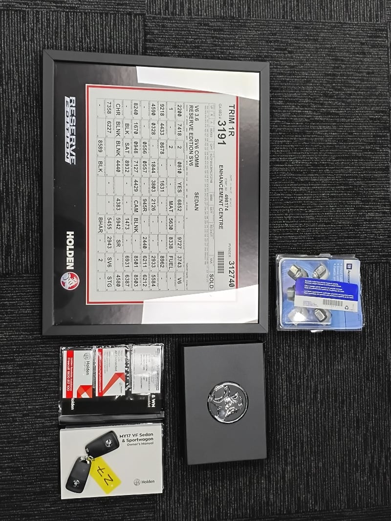 2017 Holden Commodore VF ii SV6 - Reserve Edition Year: 2017 Make: Holden Model: Commodore Series: VF ii Badge: SV6 Body: 4-Door Sedan Drive Type: Rear wheel drive Odometer: Indicating 11,000 Kilometers Engine: 3.6 V6 Petrol Transmission: Automatic Colour: Red Seats: 5 Description/extras: Vendor Advises: The Reserve Edition was a limited edition model, offered only to Holden Employees who met certain criteria. It includes special features not found on standard models and was to allow those who built the Commodore to own a final edition that carried special touches. Features include a Reserve Embroided Dash, Reserve Badging & Bespoke 19 Inch Wheels, Commemorative Employee Key Case with 2 Remote Keys. Framed Production Line Broadcast Sheet, Sat Nav, Heads Up Display, Body Kit, Exhaust + Suspension Upgrade, Front Woolen Sheepskin Covers. Price Guide - $50,000 - $60,000 VIN: 6G1FB5E36HL312740 ENG No: LFX162570003 AS PER PPSR #CCALL #CCAUS (Key #C12) Lloyds stock #339431+1