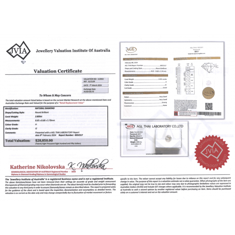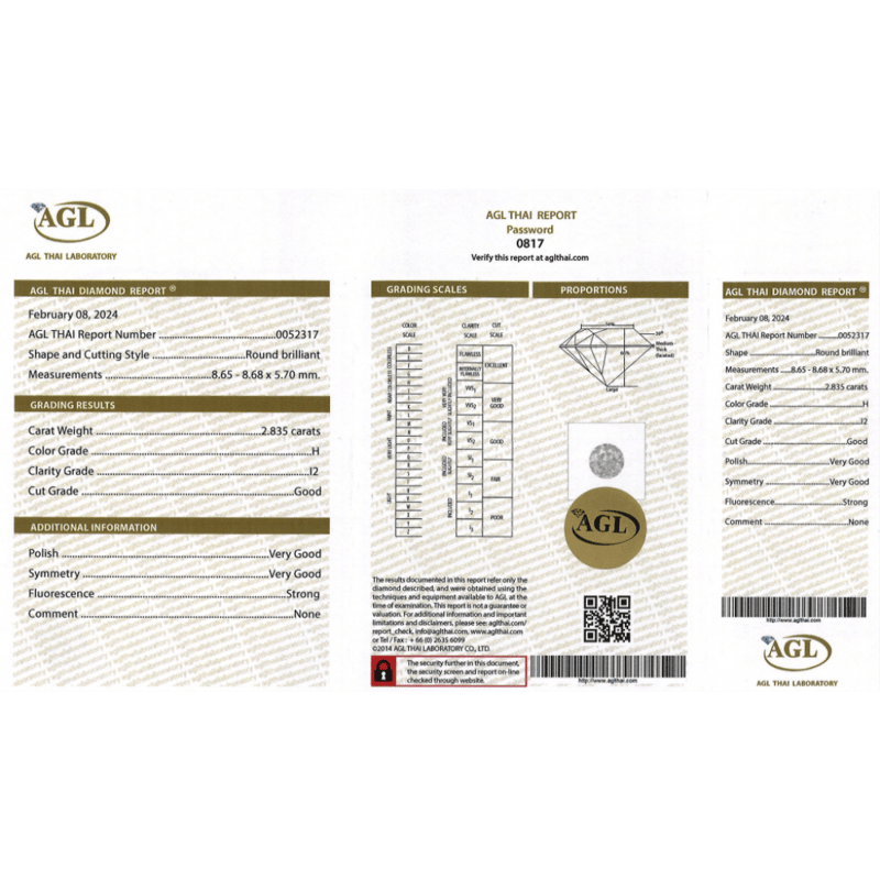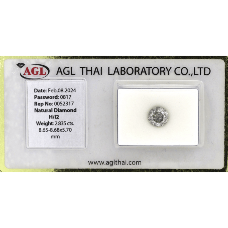 2.835Ct Certified, Natural Diamond, Round Brilliant Cut, H Colour, I2 Clarity, Loose, Unset. Stone Comes Sealed With Agl Report: 0052317.