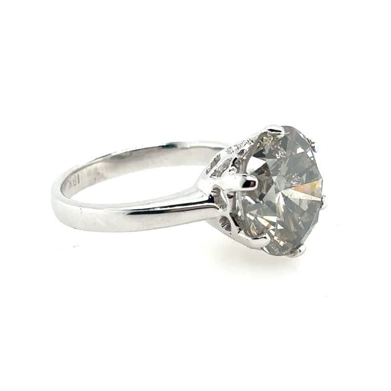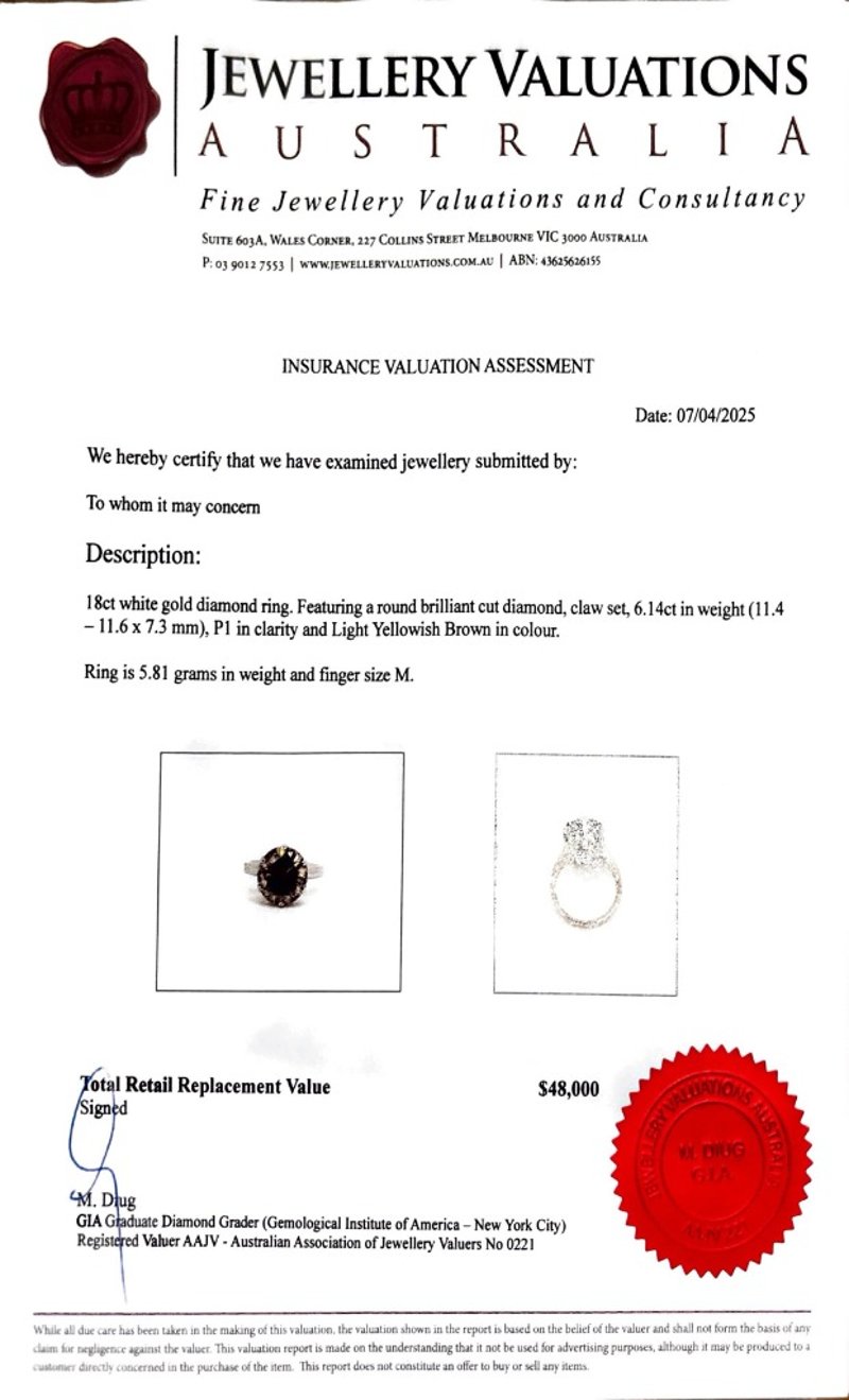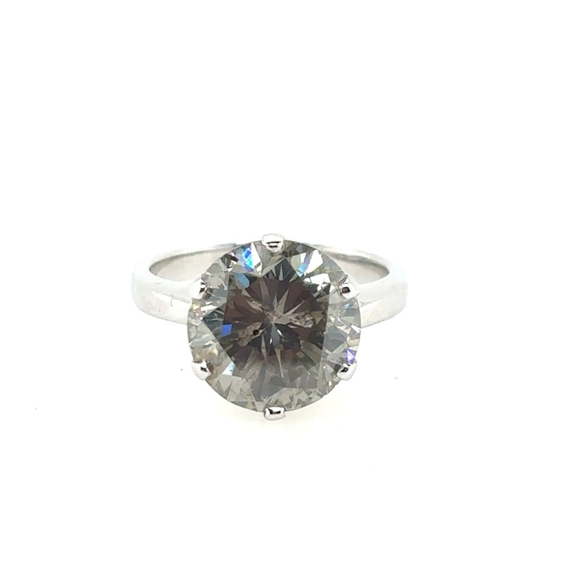 Featuring A Round Brilliant Cut Diamond, Claw Set, 6.14Ct In Weight (11.4 - 11.6 X 7.3 Mm), P1 In Clarity And Light Yellowish Brown In Colour. Ring Is 5.81 Grams In Weight And Finger Size M