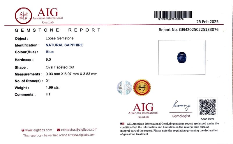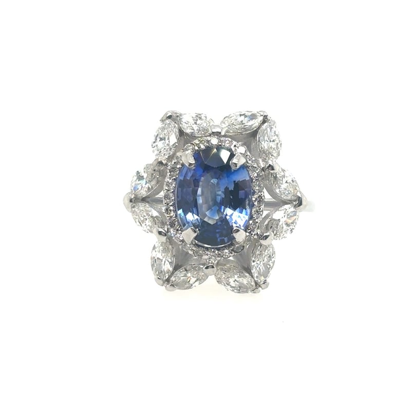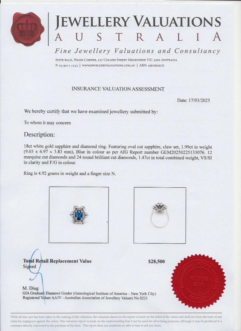 18CT WHITE GOLD SAPPHIRE AND DIAMOND RINGFeaturing Oval Cut Sapphire, Claw Set, 1.99Ct In Weight (9.03 X 6.97 X 3.83 Mm), Blue In Colour As Per Aig Report Number Gem20250225133076. 12 Marquise Cut Diamonds And 24 Round Brilliant Cut Diamonds, 1.47Ct In Total Combined Weight, Vs/Si In Clarity And F/G In Colour. Ring Is 4.92 Grams In Weight And A Finger Size NAccompanied By A Report From AigTotal Item Weight: 4.92gCondition: Good - Refer To ImagesThis valuation has been conducted by an independent third-party professional. The valuation amount is an assessment by the issuing valuer and does not reflect the auction value of the item.Any inquiries regarding the valuation should be directed to the issuing valuer (refer to contact details on the certificate), as Lloyds Auctions has no affiliation or influence over the valuation, the valuer, or the stated amount.Insurance Replacement Valuation Amount: $28,500.00CROSSDOCK162896+6