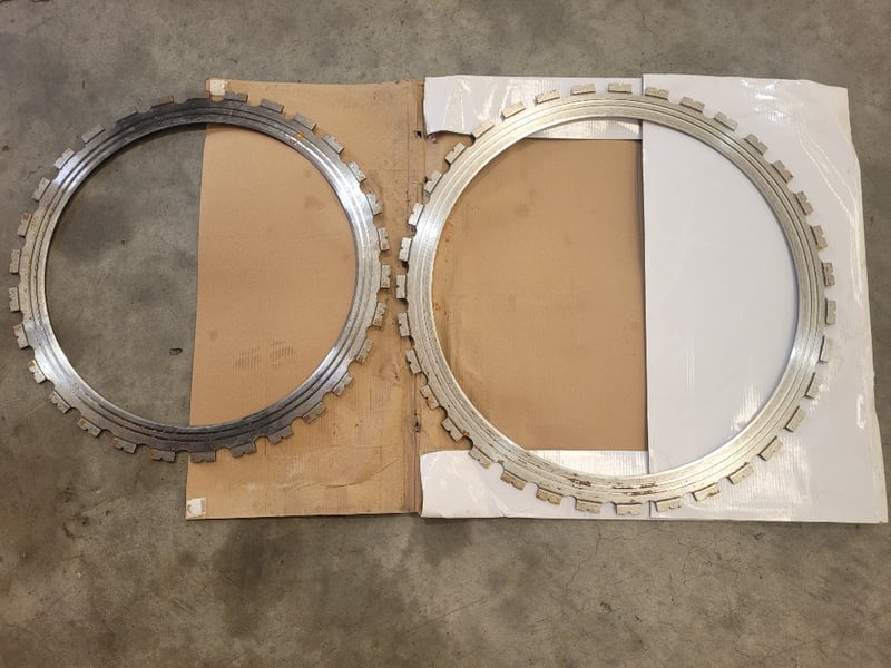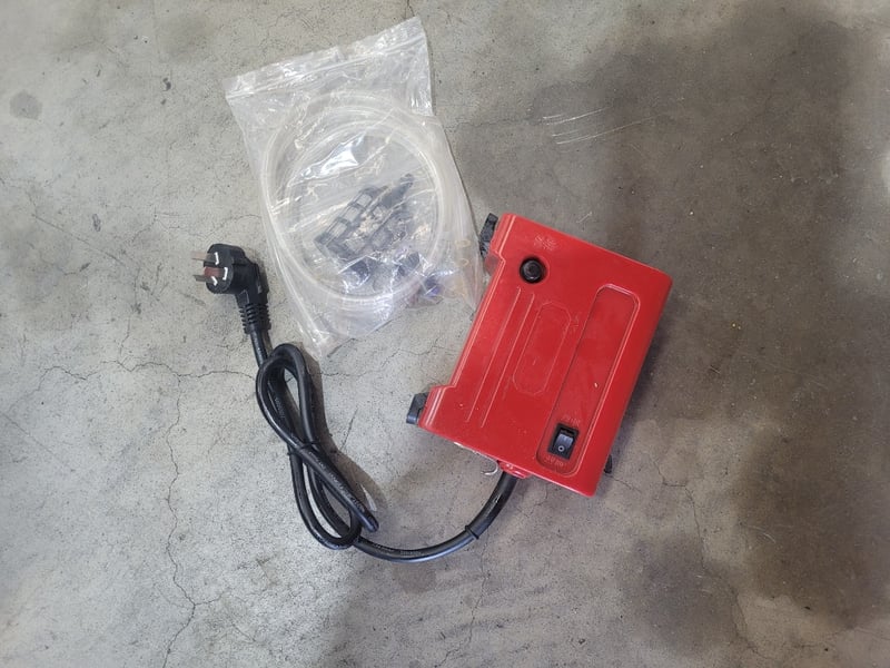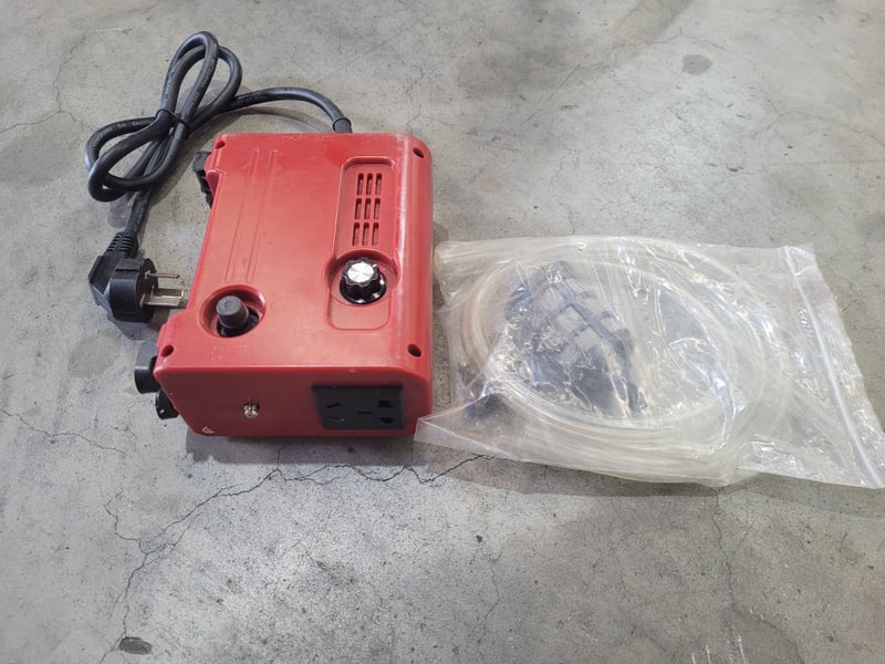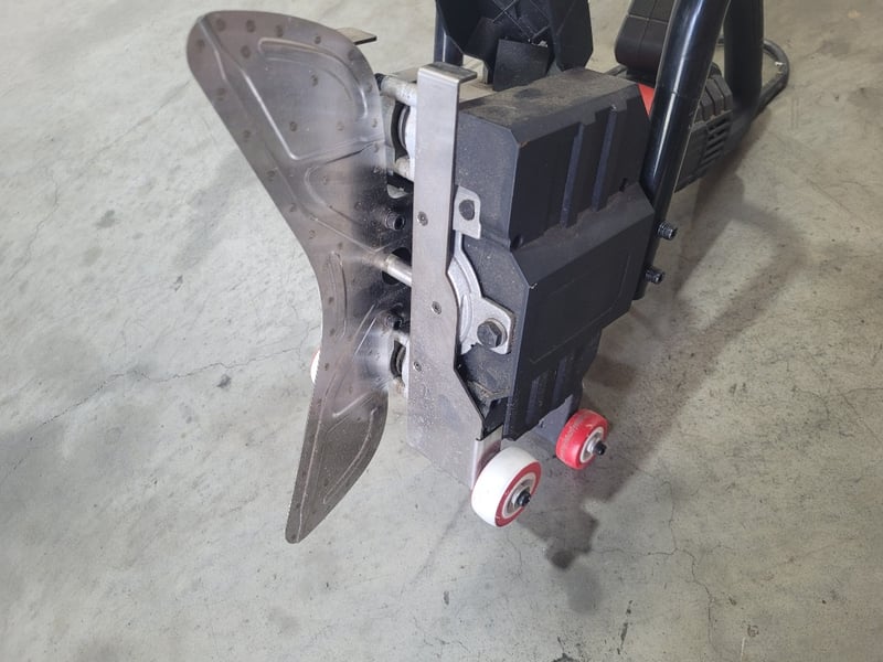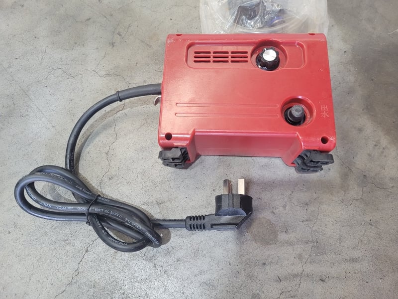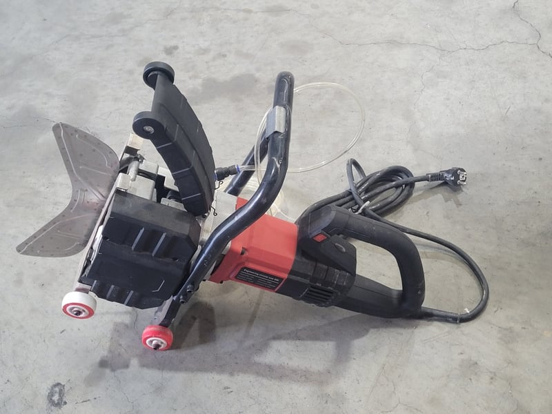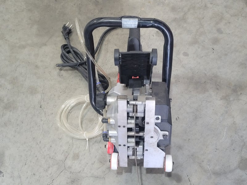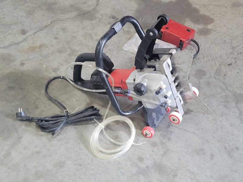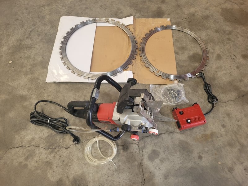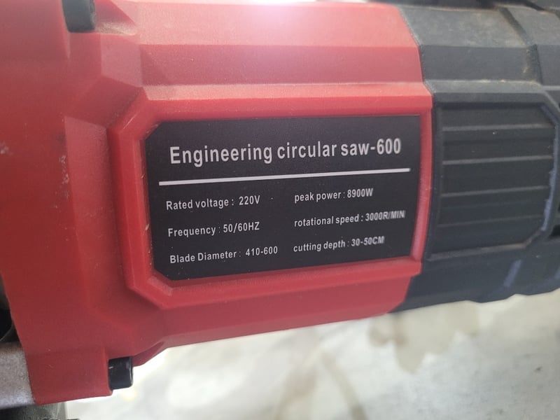 Description: 220V, vendor advises blades fit saw blade dimensions 550mm - 650mm, electric, water pump, guide wheels.