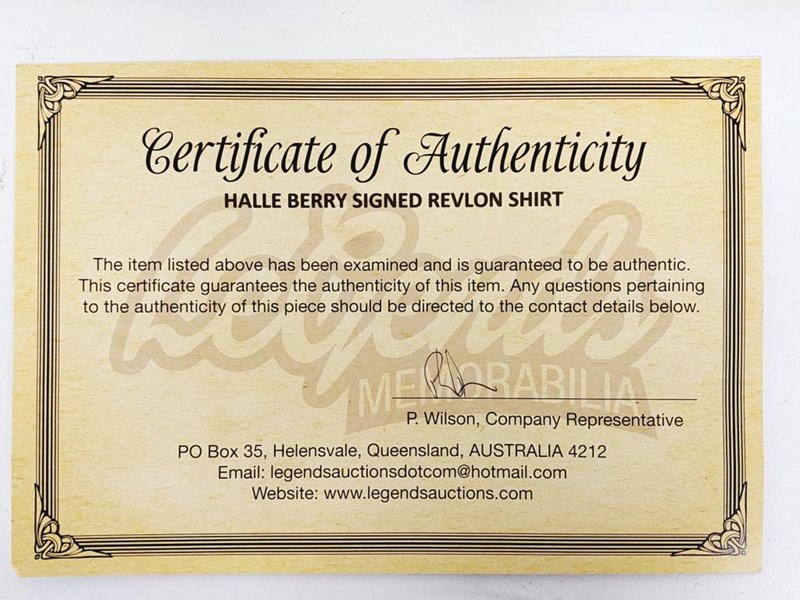 HALLE BERRY HANDSIGNED & ENSCRIBED REVLON SHIRT Comes With Certificate Of Authenticity Size: Condition: Excellent - Refer To Images 155566+91