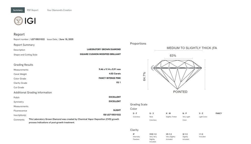 4.02 CARATS FANCY INTENSE PINK/VS1 LAB GROWN DIAMOND - IGI CERTIFIED 4.02 Carats Fancy Intense Pink/Vs1 Lab Grown Diamond - Igi Certified Certificate Number - Lg715531022 Color/Clarity - Fancy Intense Pink/Vs1 Shape - Square Cushion Dimension - 9.46 X 9.14 X 5.91 Mm Cut - N/A Symmetry - Excellent Fluorescence - Slight Polish - Excellent External Video Link - Https://Kn360.S3.Eu-North-1.Amazonaws.Com/715531022.Html 0 +229