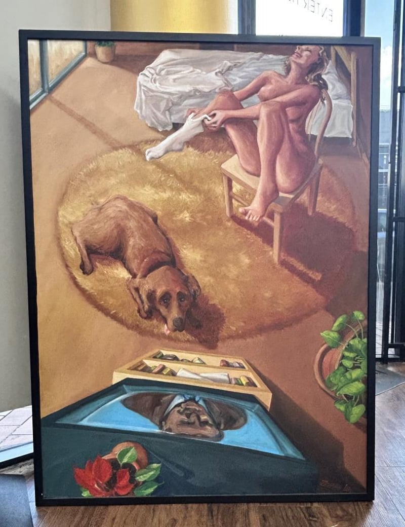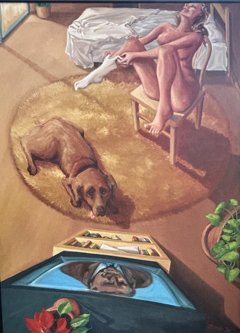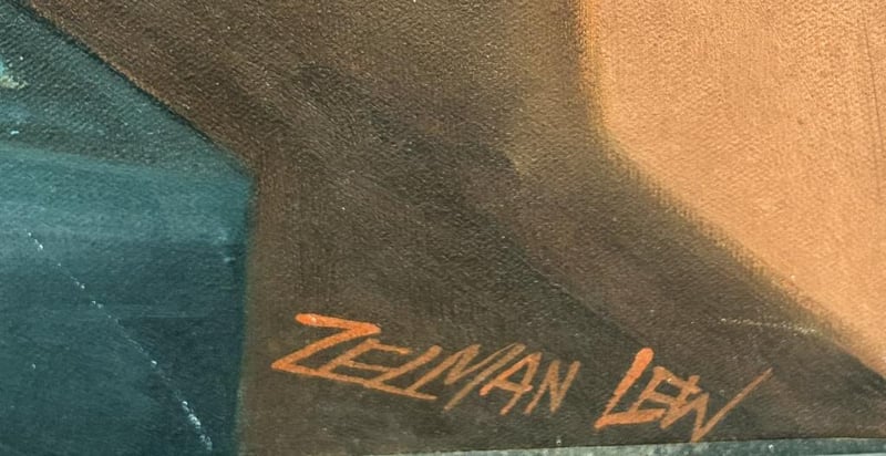 ZELMAN LEW SIGNED PAINTING "GIRL IN CHAIR WITH DOG WATCHING TV" ACRYLIC ON CANVAS, IMAGE MEASURES W91.5XH121.5CM, SIGNED BOTTOM RIGHT.