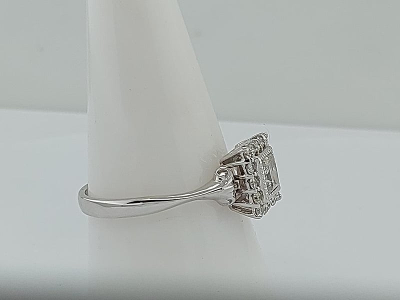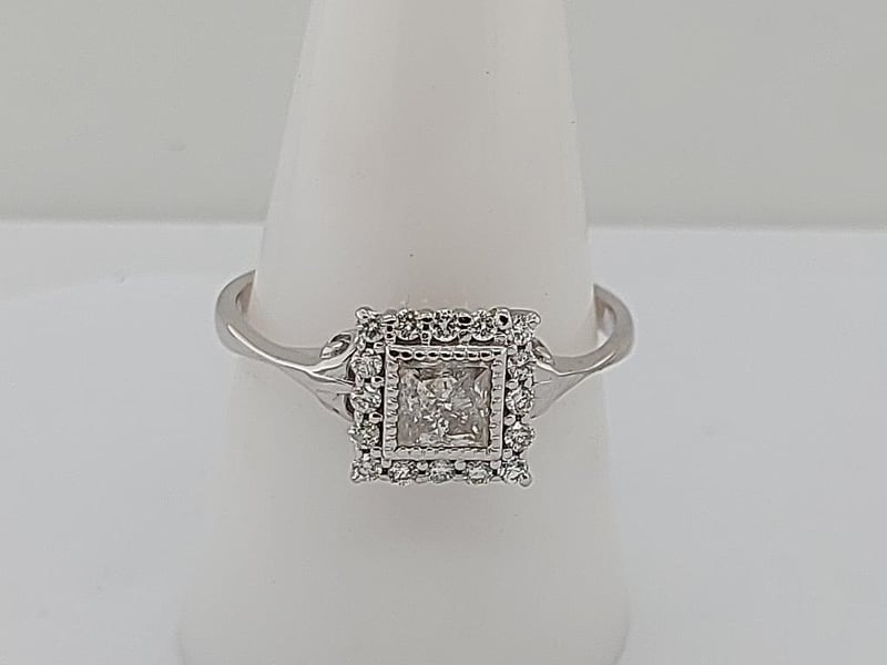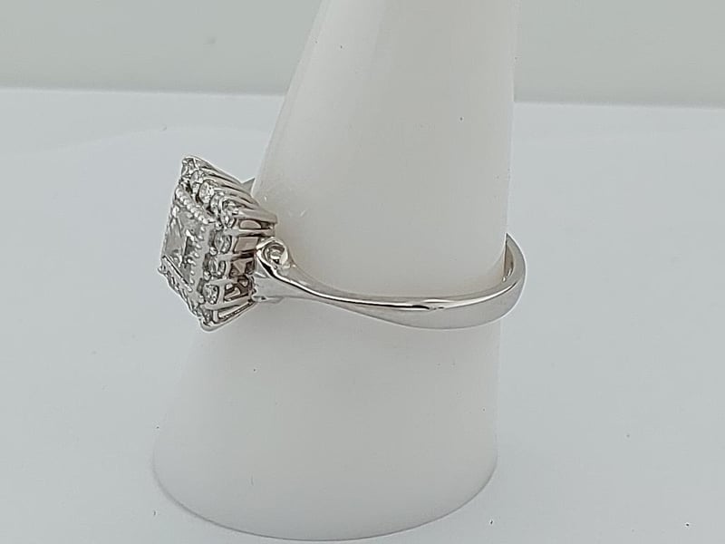 THE RING HAS A 0.76CT (ESTIMATED WHILST SET) PRINCESS CUT DIAMOND CLARITY P1-P2, COLOUR I-J BEZEL SET IN THE CENTRE WITH 16 ROUND BRILLIANT CUT DIAMONDS CLARITY SI1-P1, COLOUR I-L TOTALLING 0.24CT CLAW SET AROUND THE OUTER EDGE OF THE CENTRE SETTING. THE BAND IS SLIGHTLY ROUNDED MEASURING 2.57MM WIDE ON THE BOTTOM AND SWEEPS UP INTO A FILIGREE DESIGN MEASURING 5.00MM WIDE ON THE SIDES OF THE CENTRE SETTING.
