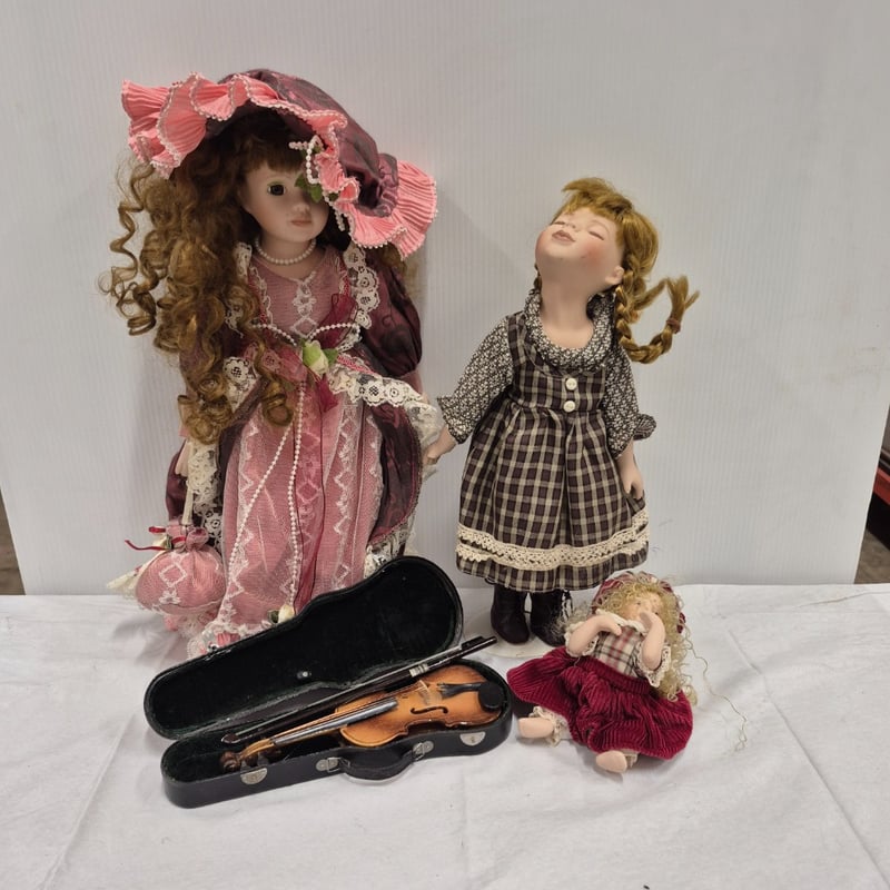 3 VINATGE DOLLS WITH SMALL VOLIN CASE, VIOLIN AND BOWCondition: Good - Refer To ImagesLOCATED RACK 10C586111+20