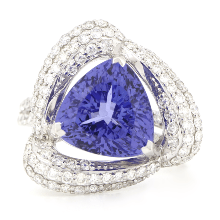 14K White Gold, 8.49Ct Tanzanite And Diamond, Cocktail Ring. The Centre Features, One Trilliant Mixed Cut, Deep Purple Violet, Tanzanite (8.49Ct, Eye Clean Clarity), V Prong Set. Surrounding The Centre In A Halo And Decorating The Band Are, 144 Round Brilliant Cut, Diamonds (1.53Ct Tdw, G-H Colour, Si1-Si2 Clarity), Micro-Bead Set In White Gold. Ring Size Q 1/2.