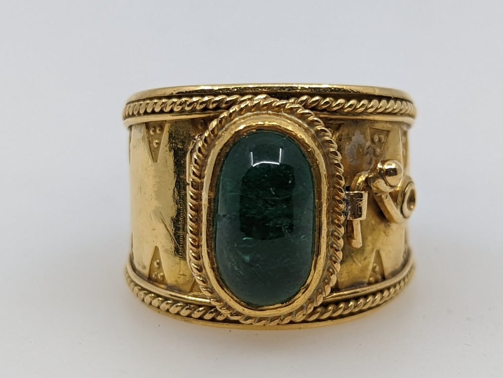 Featuring An Oval Cut Cabochon Emerald Rub Over, Set With Twisted Wire Surround As A Hinged Lid, With A Wire Hook On A Tapered Flat Hollowed Center And With A Textured Triangular Patterned Edge And Raised Wire Feature Outer Edge