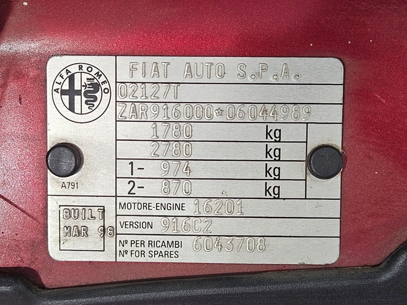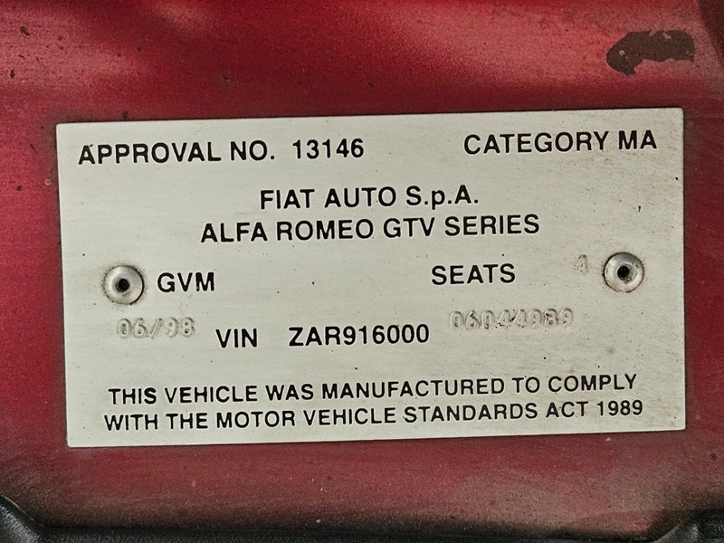 1998 Alfa Romeo GTV Year: 1998 Make: Alfa Romeo Model: GTV Body: 2-Door Coupe Drive Type: Rear wheel drive Odometer: Indicating 184,547 Kilometers Engine: 2.0 I4 Petrol Transmission: Manual Colour: Red Seats: 4 Description/Extras: Sunroof, full service history. Price Guide - $3,000 - $5,000 (Based on Unmodified Vehicle) VIN: ZAR91600006044989 ENG No: AR162010993546 (as per PPSR) (Key #C7 ajax) Lloyds stock #162774+1 #CCEUR #CCALL