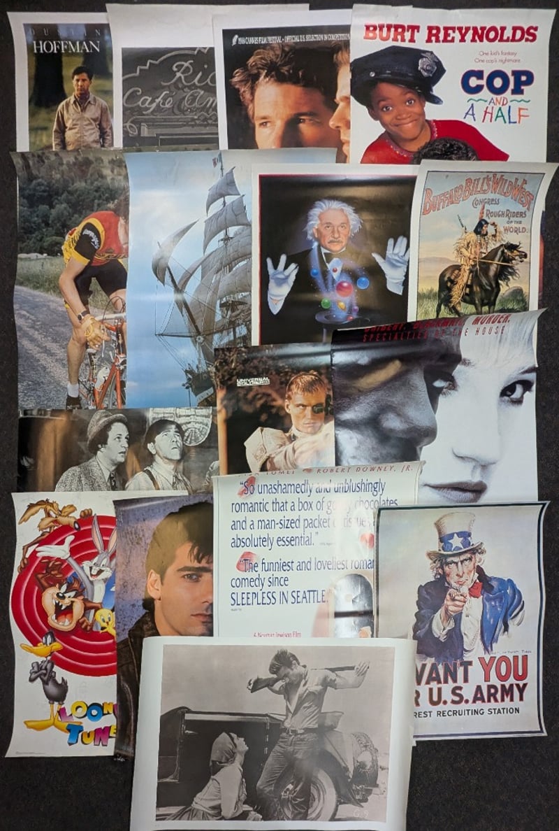 COLLECTION OF POSTERS Posters Include 'Rain Man', Casablanca, 'Miles From Home', 'Cop And A Half', 'The Cosmic Magician - Albert Einstein', Buffalo Bills Wild West, 'Universal Soldier', Three Stooges, 'Bad Company', 'Looney Tunes', 'Wiseguy', 'Only You', Uncle Sam Poster, 'Giant' Poster Lengths Approx: 65-100Cm Some Posters Have Wear And Tear Condition: Good - Refer To Images 584886+9