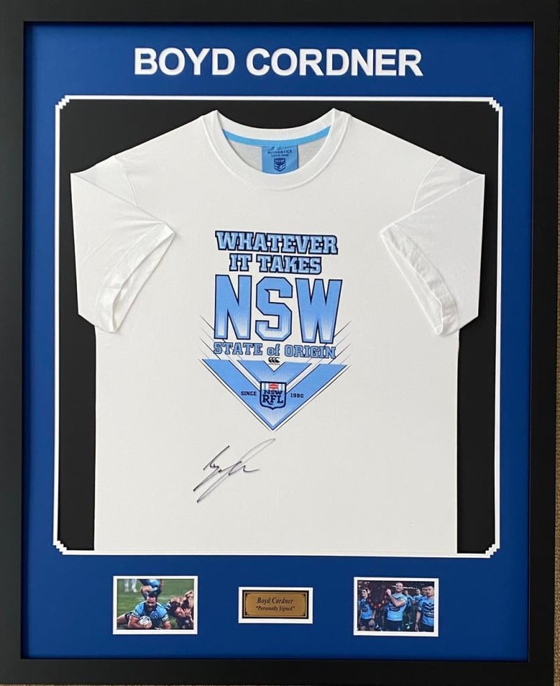 BOYD CORDNER PERSONALLY SIGNED NEW SOUTH WALES STATE OF ORIGIN SHIRT Framed Using Double Mats, 2 Unsigned Photographs And A Plaque. Hand Signed By Boyd Cordner Using A Black Marker. Accompanied By A Certificate Of AuthenticityCondition: Good - Refer To Images488263+4