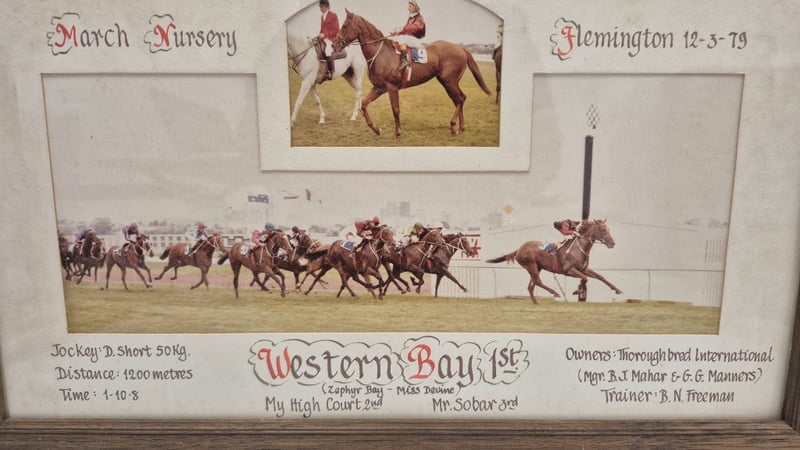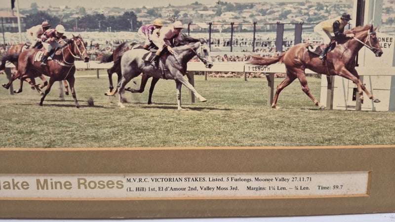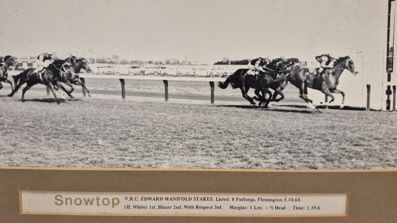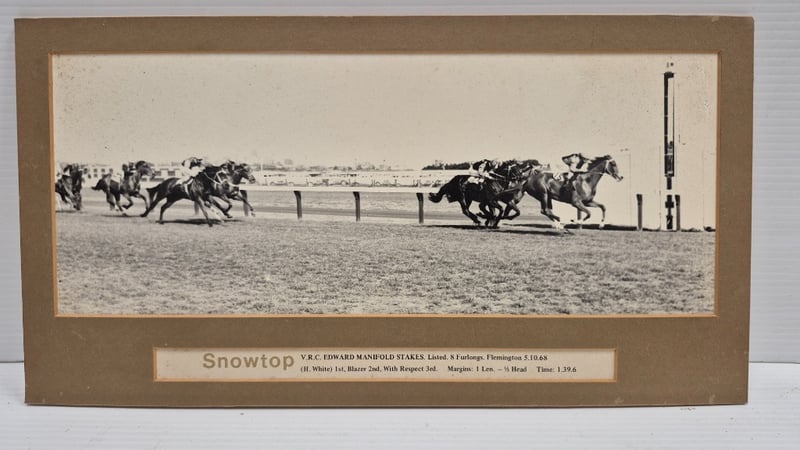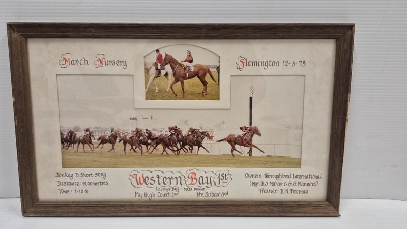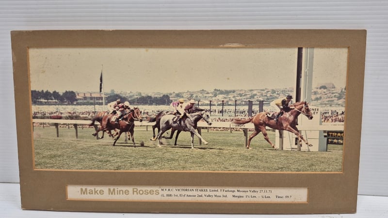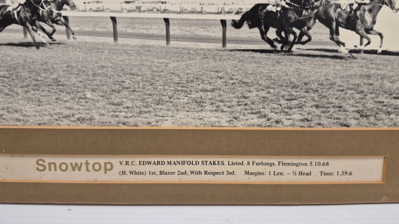 ASSORTED VINTAGE HORSE RACING WINNERS PHOTO MEMORABILIA WESTERN BAY 1ST 1979 DAMAGED FRAME SNOWTOP 1ST 1968 MAKE MINE ROSES 1ST 1971 Condition: Fair - Refer To Images LOCATED RACK 13A 587652+7