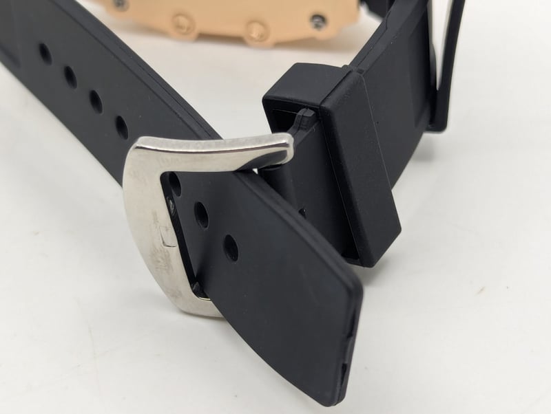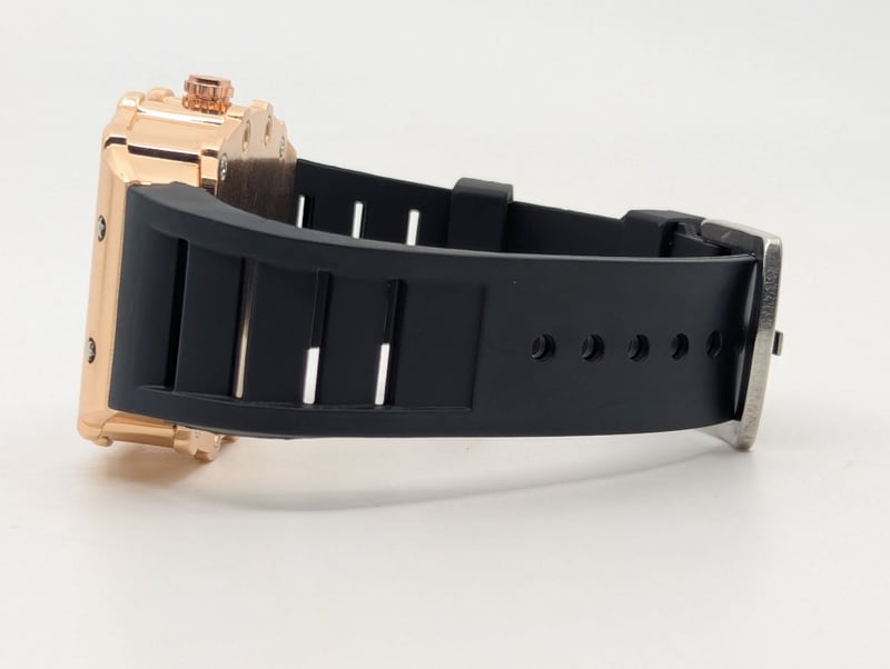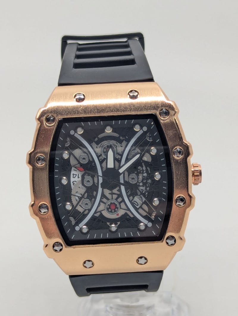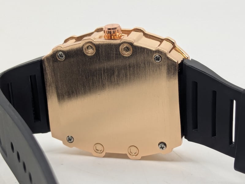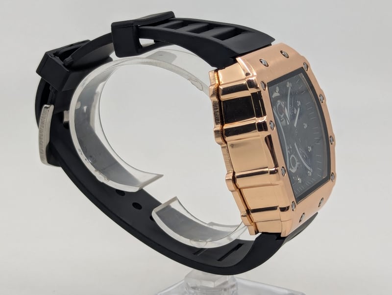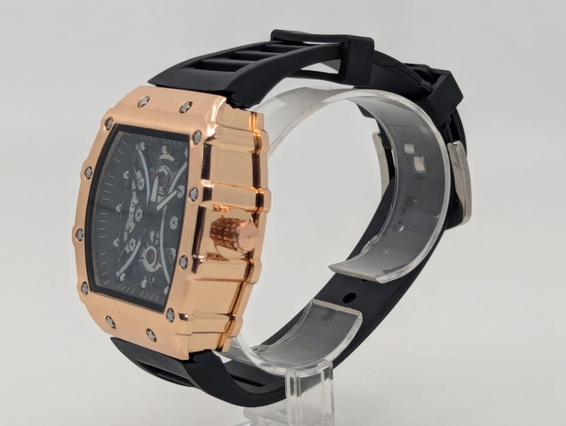 MENS LEFT HANDED (DESTRO) WRIST WATCH DIAL: BLACK FACE, LUMINOUS HANDS AND HR MARKERS CASE DESCRIPTION: GOLD TONE STEEL CASE SIZE: 42MM BRACELET: TWO PIECE SYTHETIC STRAP WITH CHROMED BUCKLE MOVEMENT: UNKNOWN BOX: NOT INCLUDED PAPERS: NOT INCLUDED WORKING: YES Condition: Good - Refer To Images 9A 586016+3