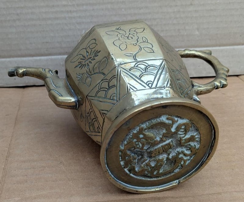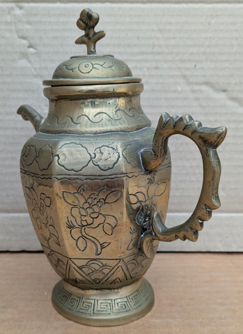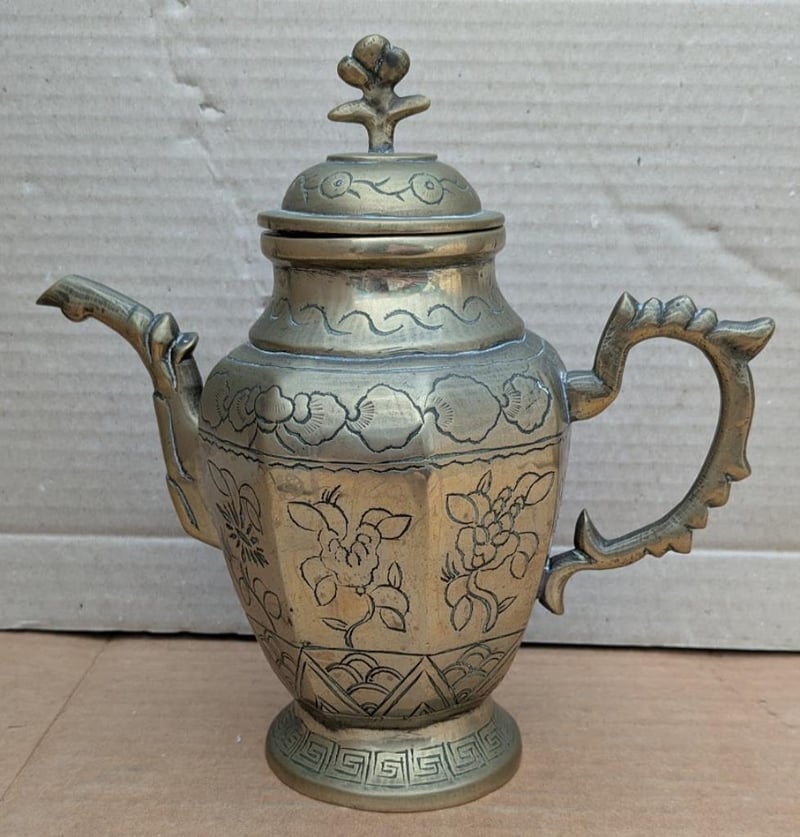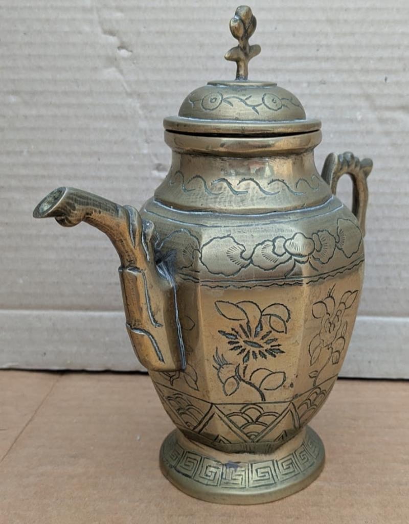 VINTAGE OLD BRASS TEAPOT WITH DRAGON AND FLORAL ETCHED 19CM TALL 19CM TALL