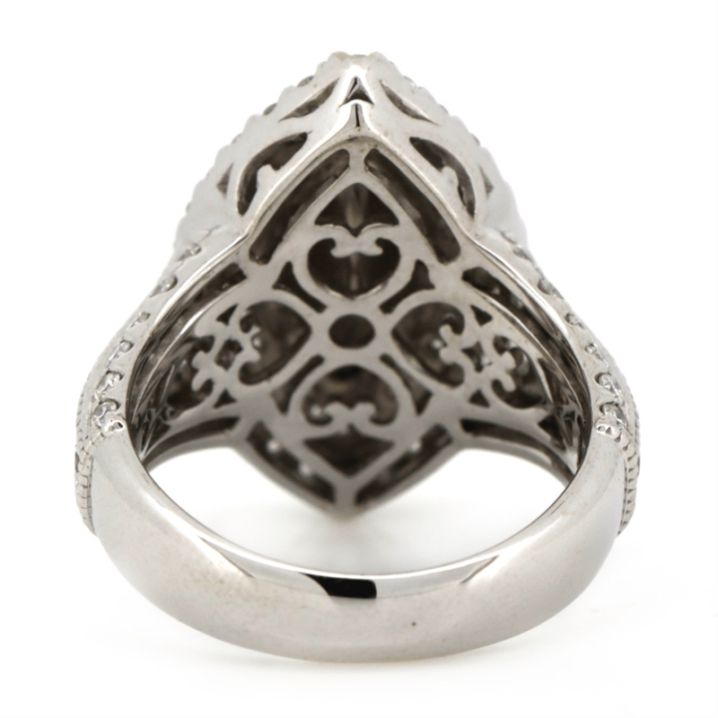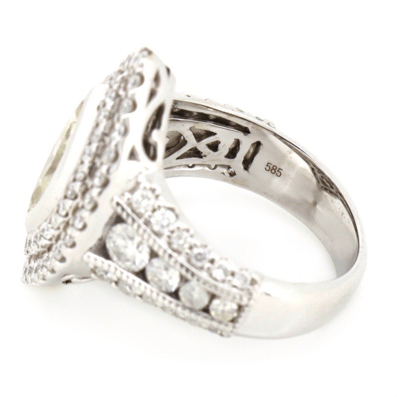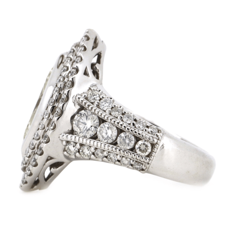 14K WHITE GOLD, FANCY YELLOW DIAMOND, DOUBLE HALO RING. The Centre Features, One Marquise Cut, Light Fancy Yellow, Diamond (0.70Ct, P2+ Clarity), Bezel Set. Encompassing The Design Are, 86 Round Brilliant Cut, Diamonds (1.72Ct Tdw, H-K Colour, P1+ Clarity), Pip Claw/Bead Set. Ring Size L 1/2. 14K White Gold, Fancy Yellow Diamond, Double Halo Ring. The Centre Features, One Marquise Cut, Light Fancy Yellow, Diamond (0.70Ct, P2+ Clarity), Bezel Set. Encompassing The Design Are, 86 Round Brilliant Cut, Diamonds (1.72Ct Tdw, H-K Colour, P1+ Clarity), Pip Claw/Bead Set. Ring Size L 1/2. Valuations Provided by an Independent Third-Party Professional Not Directly Associated With Lloyds Auctions at AUD $$41,900.00This valuation has been conducted by an independent third-party professional. The valuation amount is an assessment by the issuing valuer and does not reflect the auction value of the item. Any inquiries regarding the valuation should be directed to the issuing valuer (refer to contact details on the certificate), as Lloyds Auctions has no affiliation or influence over the valuation, the valuer, or the stated amount. Condition: Good - Refer Images 0645838+5398