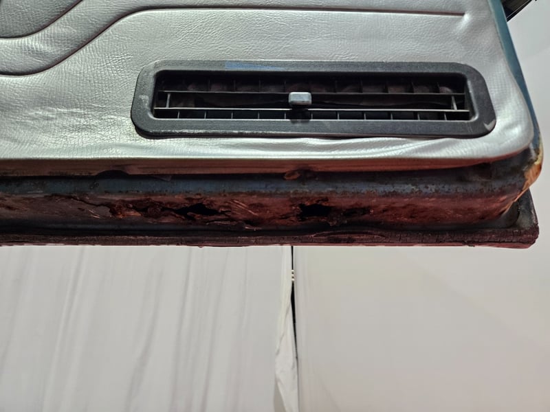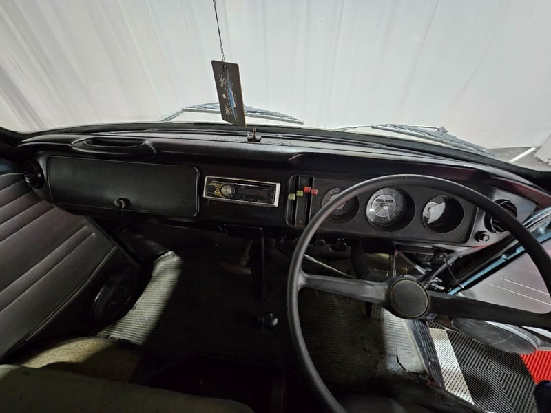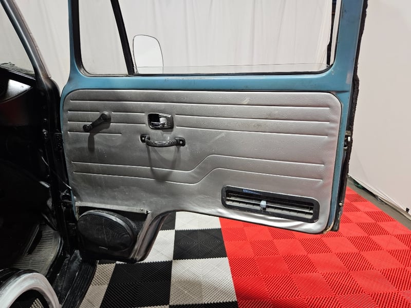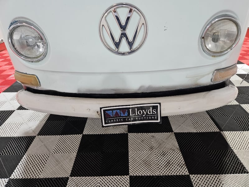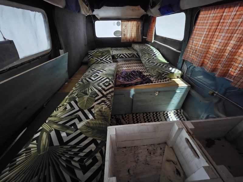 This 1973 Volkswagen Kombi is a pop-top camper, equipped with seating and cushions, a storage cabinet, and a ready-made platform for a mattress — a simple yet functional setup for weekends away or restoration into a period-correct camper. Finished in Light Blue, it shows rust, paint damage, dents, marks and scratches consistent with age, and the vendor notes the driver’s door does not open from the inside.