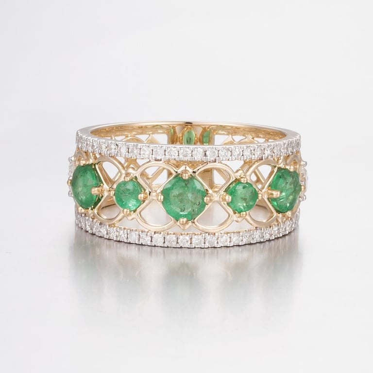 14CT YELLOW GOLD BRAZILIAN EMERALD AND DIAMOND DRESS RING. Featuring Centre, 5 Round Cut, Medium Bluish-Green Brazilian Emeralds (0.95Ct Tsw, Heavy Inclusions), Claw Set, With 56 Round Brilliant Cut Diamonds (0.50Ct Tdw, G-H Colour, Si1-Si2 Clarity), Bead Set In White Gold. Ring Size O. Valuations Provided by an Independent Third-Party Professional Not Directly Associated With Lloyds Auctions at AUD $18800This valuation has been conducted by an independent third-party professional. The valuation amount is an assessment by the issuing valuer and does not reflect the auction value of the item. Any inquiries regarding the valuation should be directed to the issuing valuer (refer to contact details on the certificate), as Lloyds Auctions has no affiliation or influence over the valuation, the valuer, or the stated amount. Condition: Good - Refer Images 0586156+439