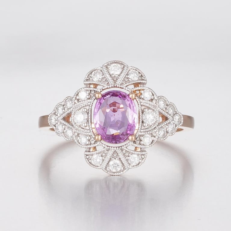 14CT ROSE GOLD PINK CEYLON SAPPHIRE AND DIAMOND ANTIQUE INSPIRED RING. Featuring Centre, One Oval Cut, Deep Vivid Orange-Pink Ceylon Sapphire (1.06Ct, Slight Inclusions), Claw Set, With 22 Round Brilliant Cut Diamonds (0.34Ct Tdw, G-H Colour, Si1-Si2 Clarity) Bead Set In White Gold. Ring Size O. Valuations Provided by an Independent Third-Party Professional Not Directly Associated With Lloyds Auctions at AUD $18200This valuation has been conducted by an independent third-party professional. The valuation amount is an assessment by the issuing valuer and does not reflect the auction value of the item. Any inquiries regarding the valuation should be directed to the issuing valuer (refer to contact details on the certificate), as Lloyds Auctions has no affiliation or influence over the valuation, the valuer, or the stated amount. Condition: Good - Refer Images 0586156+434