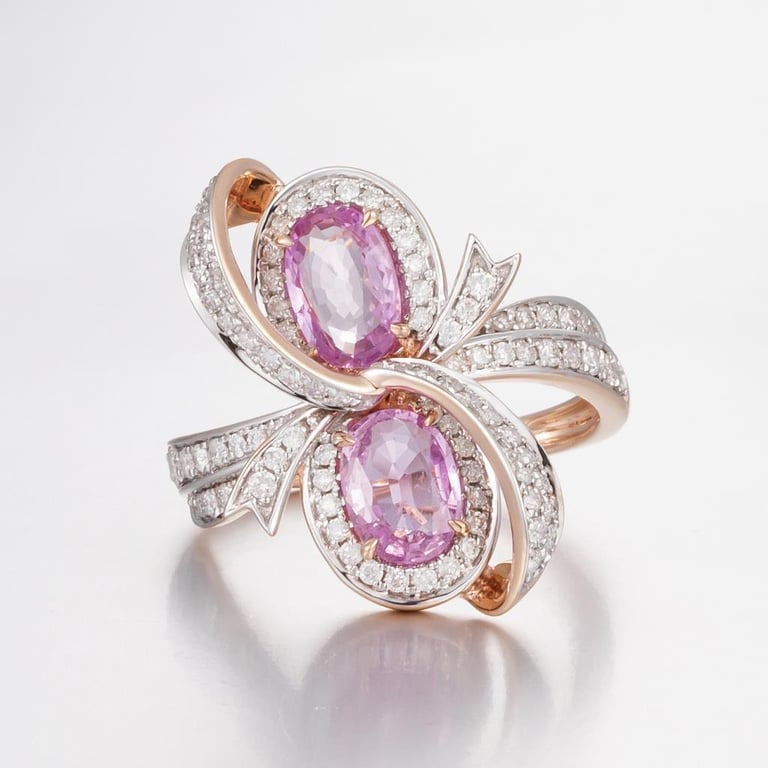 Featuring Centre, 2 Oval Cut, Light Pastel Purplish-Pink Ceylon Sapphires (1.73Ct Tsw, Very Slight Inclusions), Claw Set, With 96 Round Brilliant Cut Diamonds (0.54Ct Tdw, G-H Colour, Si1-Si2 Clarity), Bead Set In White Gold. Ring Size O.