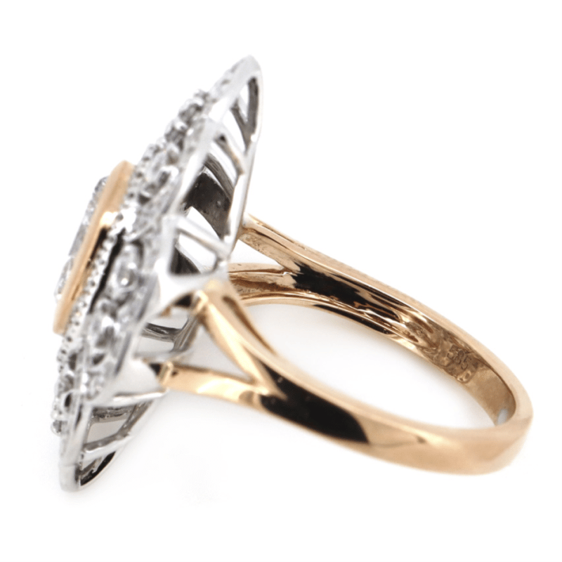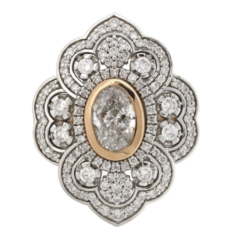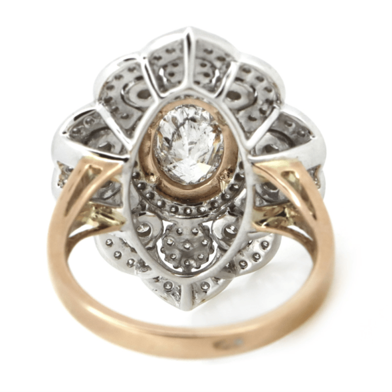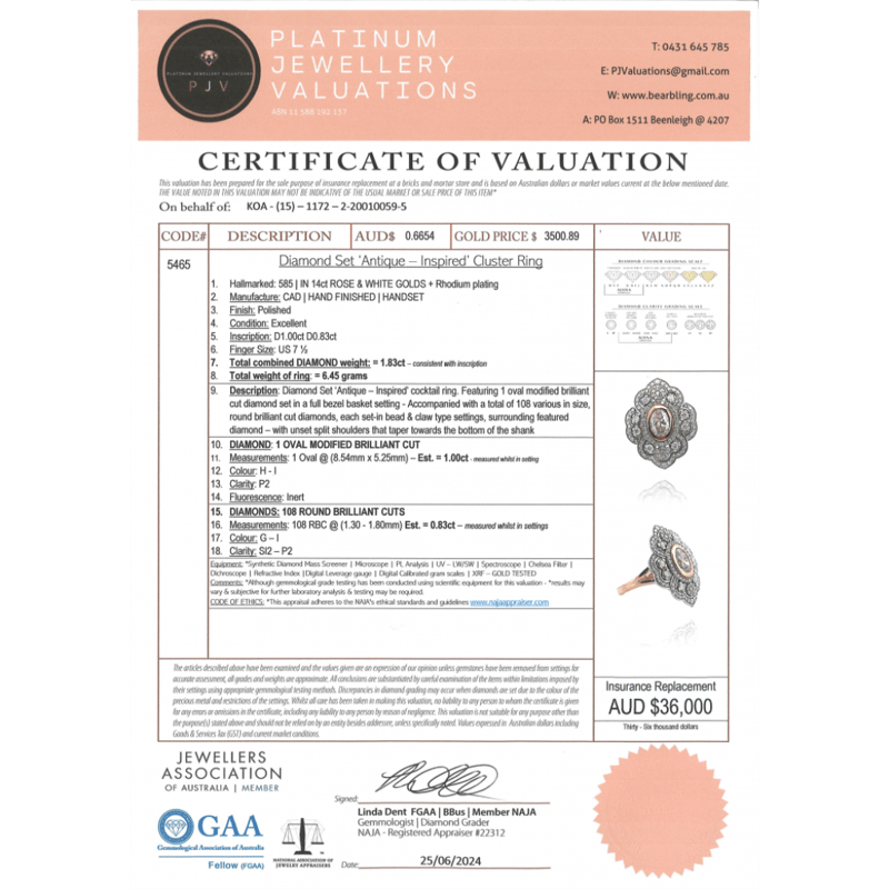 14K ROSE/WHITE GOLD AND DIAMOND, DECORATIVE CLUSTER RING. The Design Features, One Oval Modified Cut, Diamond (1.00Ct, H-I Colour, P2 Clarity), Bezel Set. Encompassing The Centre Are, 108 Round Brilliant Cut, Diamonds (0.83Ct Tdw, G-I Colour, Si2-P2 Clarity), Bead/Claw Set. Ring Size O. 14K Rose/White Gold And Diamond, Decorative Cluster Ring. The Design Features, One Oval Modified Cut, Diamond (1.00Ct, H-I Colour, P2 Clarity), Bezel Set. Encompassing The Centre Are, 108 Round Brilliant Cut, Diamonds (0.83Ct Tdw, G-I Colour, Si2-P2 Clarity), Bead/Claw Set. Ring Size O. Valuations Provided by an Independent Third-Party Professional Not Directly Associated With Lloyds Auctions at AUD $$36,000.00This valuation has been conducted by an independent third-party professional. The valuation amount is an assessment by the issuing valuer and does not reflect the auction value of the item. Any inquiries regarding the valuation should be directed to the issuing valuer (refer to contact details on the certificate), as Lloyds Auctions has no affiliation or influence over the valuation, the valuer, or the stated amount. Condition: Good - Refer Images 0645838+5333
