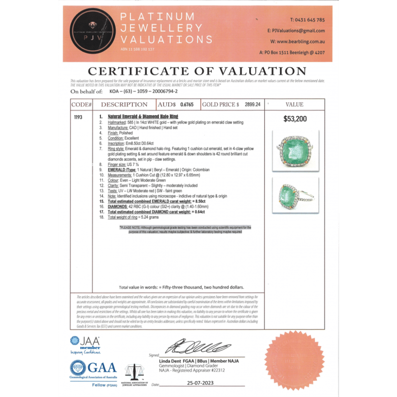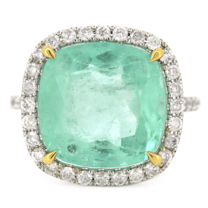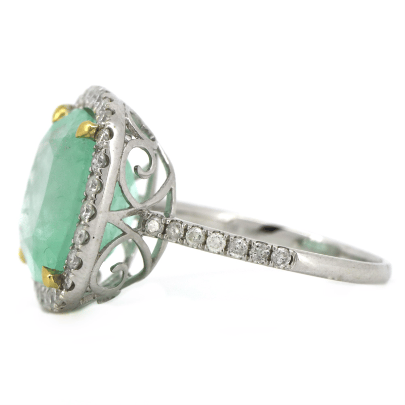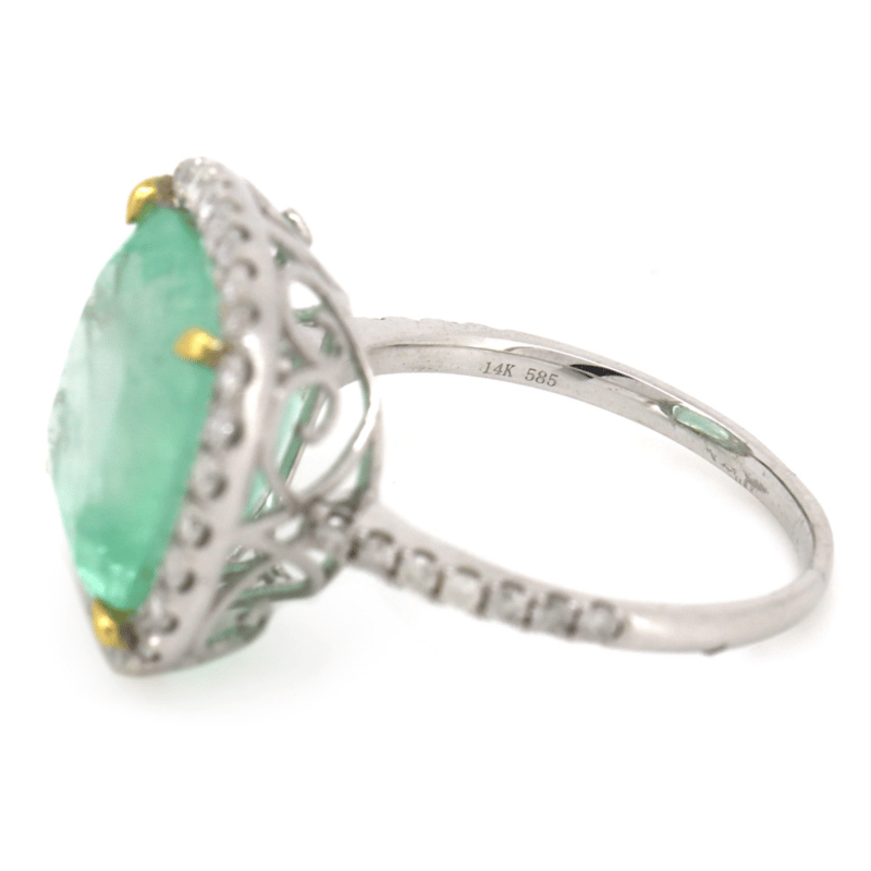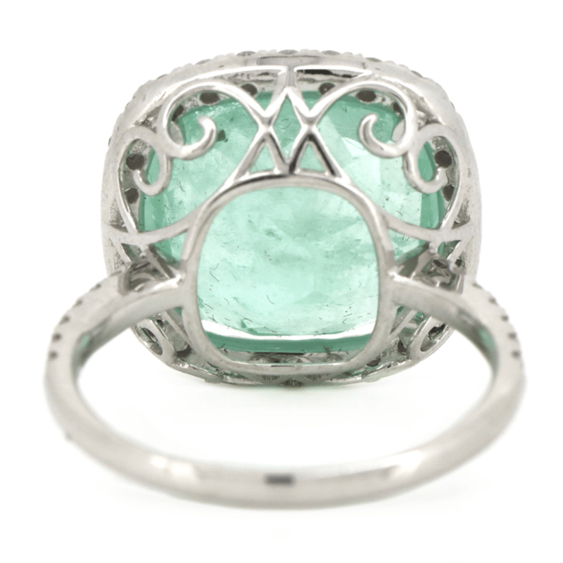 14K White Gold, 8.50Ct Colombian Emerald And Diamond, Statement Ring. The Centre Features, One Cushion Faceted Cut, Light Moderate Green, Colombian Emerald (8.50Ct, Slightly-Moderately Included), 4 Claw Set In Yellow Gold. Surrounding The Centre In A Halo And Decorating The Band Are, 42 Round Brilliant Cut, Diamonds (0.64Ct Tdw, G-I Colour, Si2+ Clarity), Pip-Claw Set. Ring Size N 1/2.