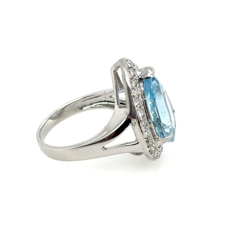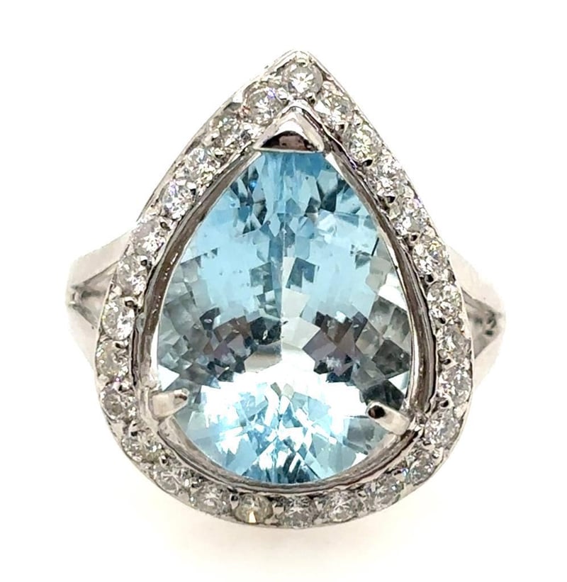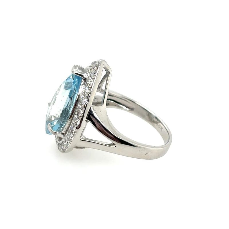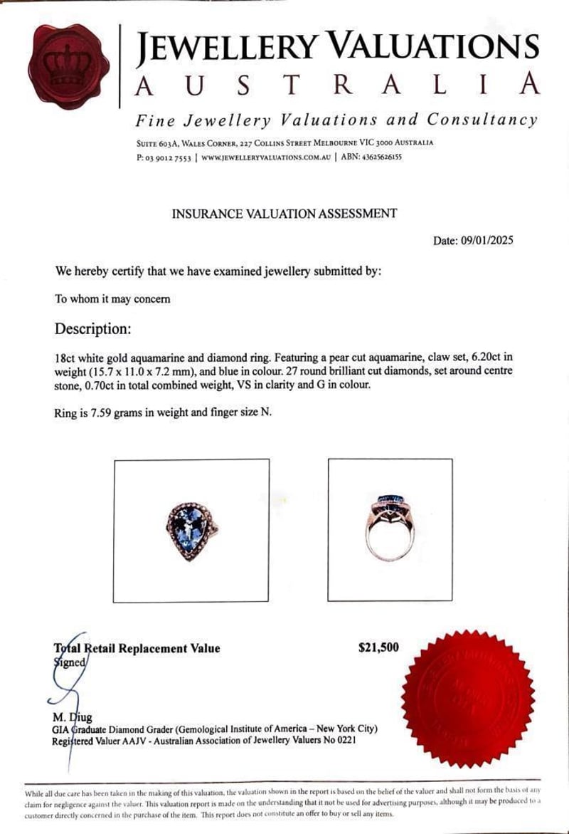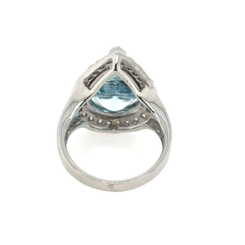 This 18Ct White Gold Ring Features 1 X 6.20Ct Pear Cut Aquamarine Measuring 15.7Mm X 11.0Mm X 7.2Mm And Is Blue In Colour With 27 X Round Brilliant Cut Diamonds Set Around The Centre Stone, 0.70Ct In Total Combined Weight, Vs In Clarity And G In Colour. Ring Size: N