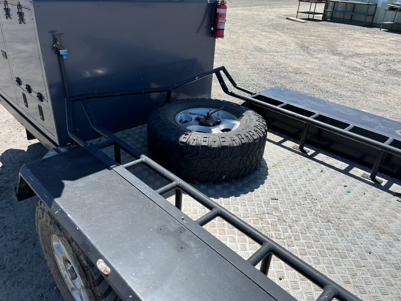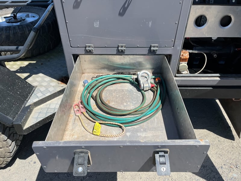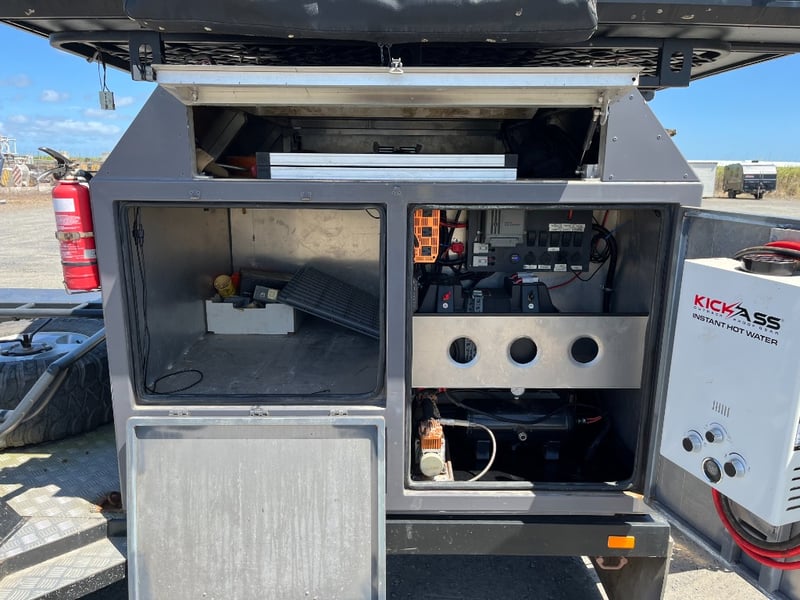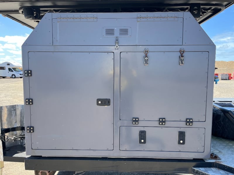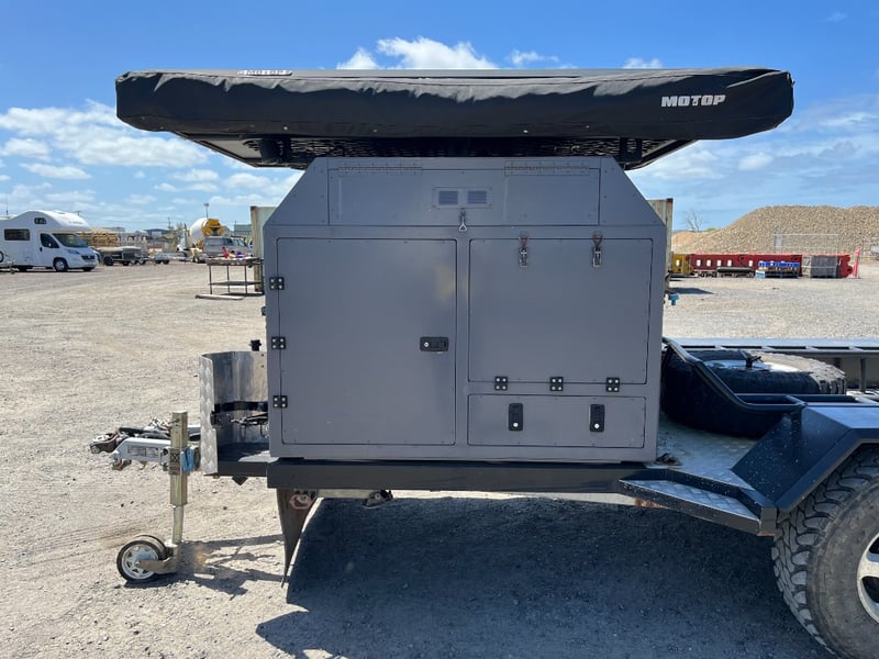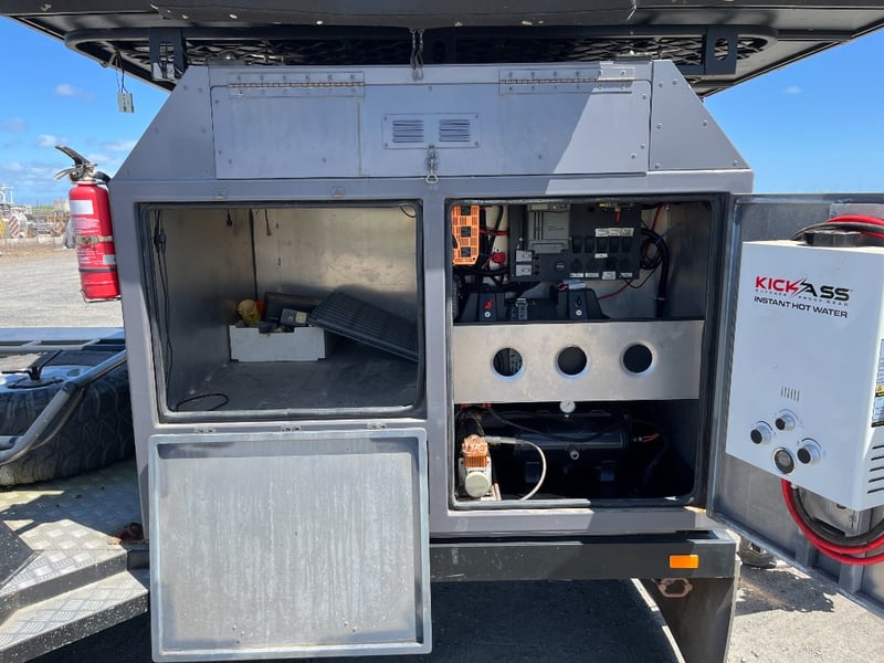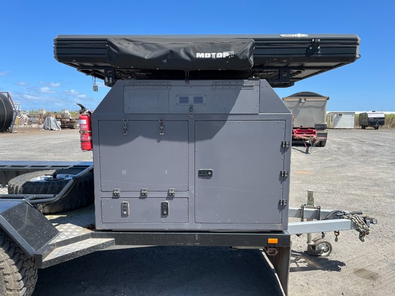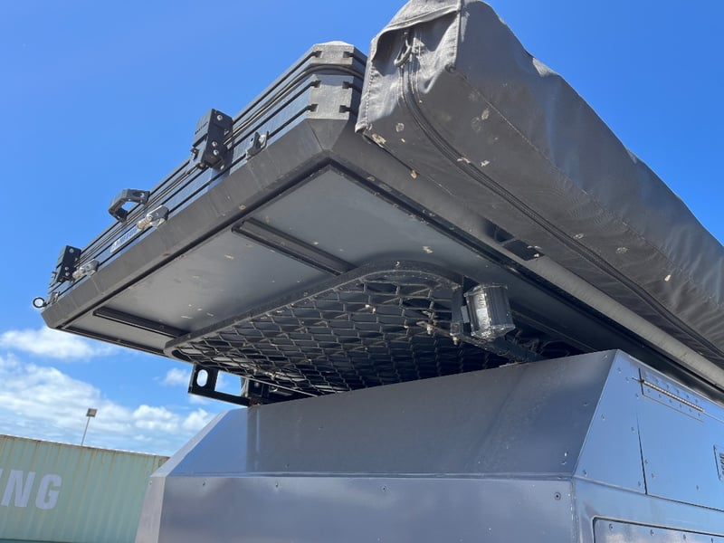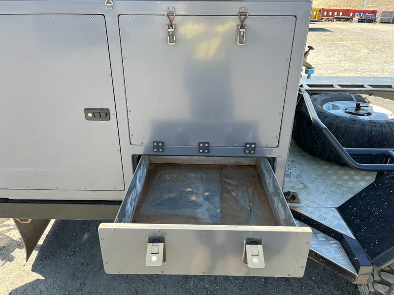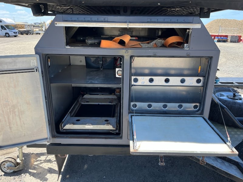 Description: same wheel base as land cruiser 200 series, 80ltr water tank underneath, set up for dual and solar battery ready to go, Hot water system, All enclosed hatches are waterproof and lockable, full 270 degrees awning, Rooftop tent, Loading ramps, Slide out fridge shelf, Lots of lighting and Plenty of storage.