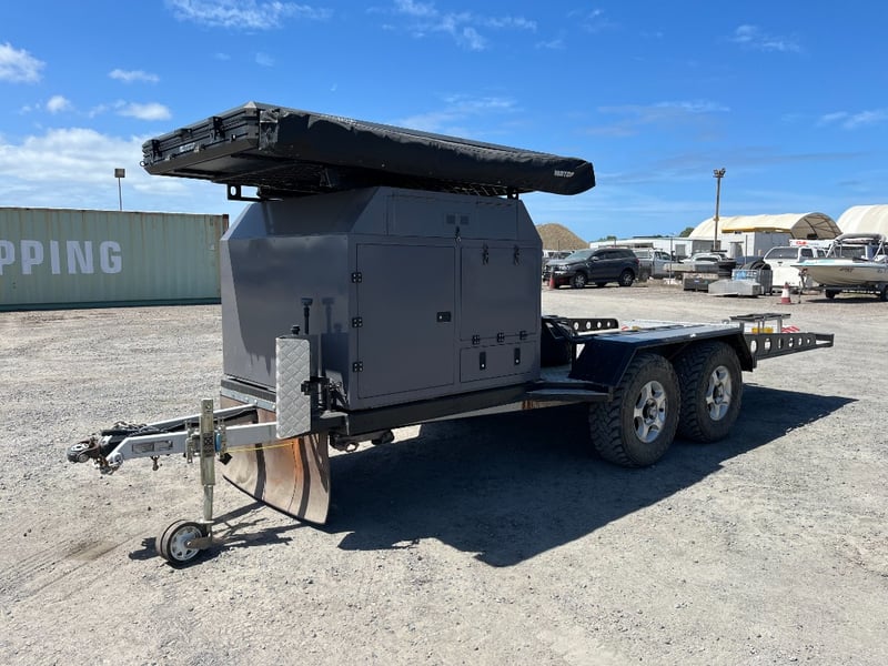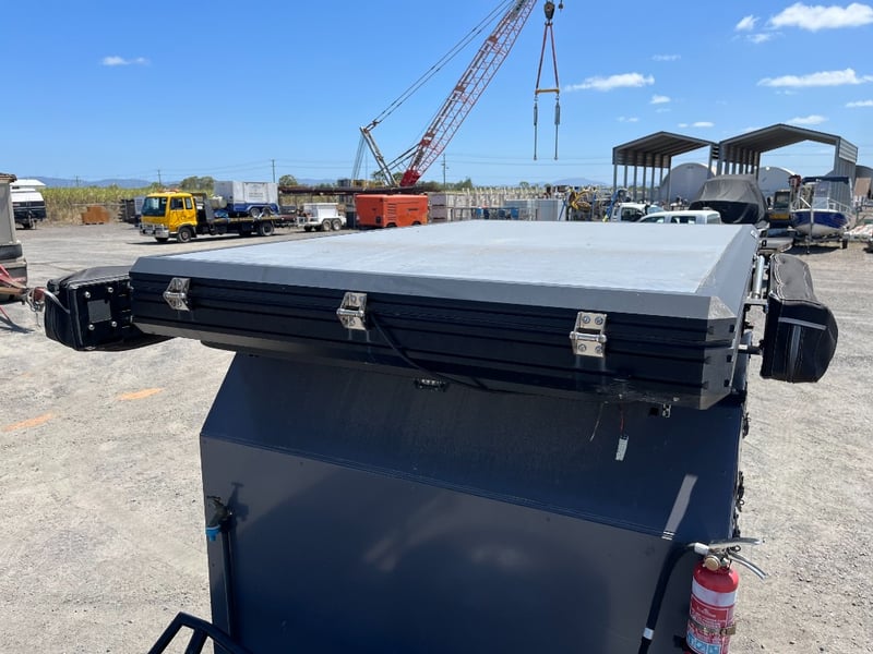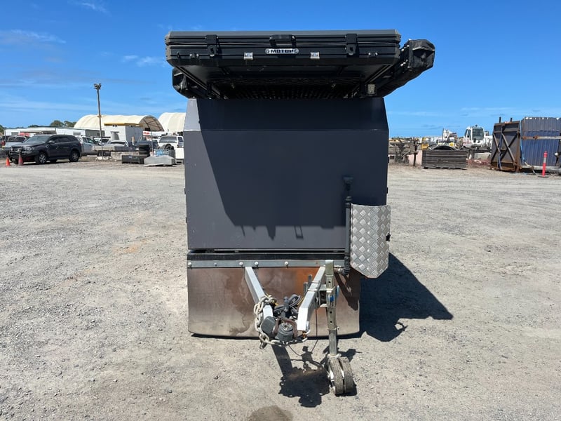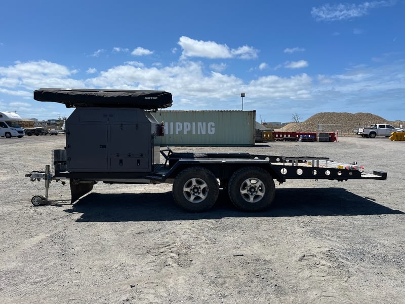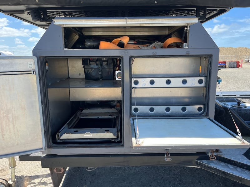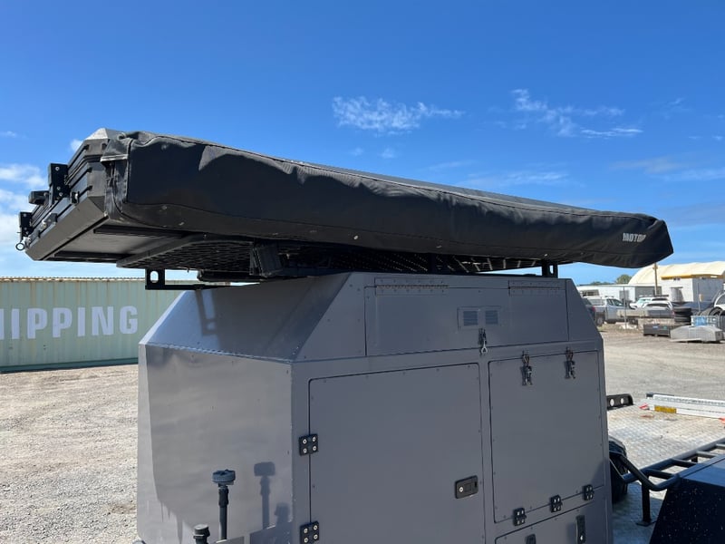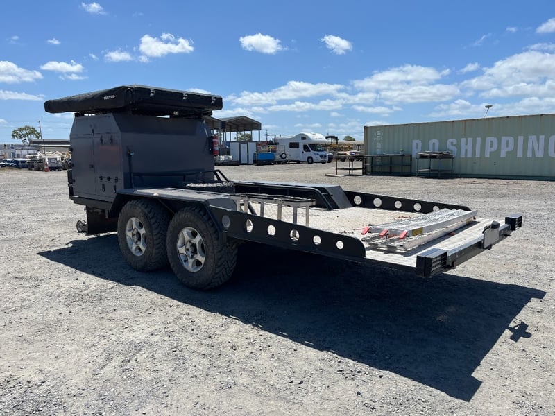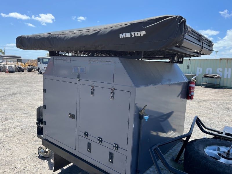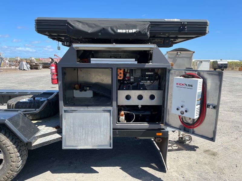 Description: same wheel base as land cruiser 200 series, 80ltr water tank underneath, set up for dual and solar battery ready to go, Hot water system, All enclosed hatches are waterproof and lockable, full 270 degrees awning, Rooftop tent, Loading ramps, Slide out fridge shelf, Lots of lighting and Plenty of storage.