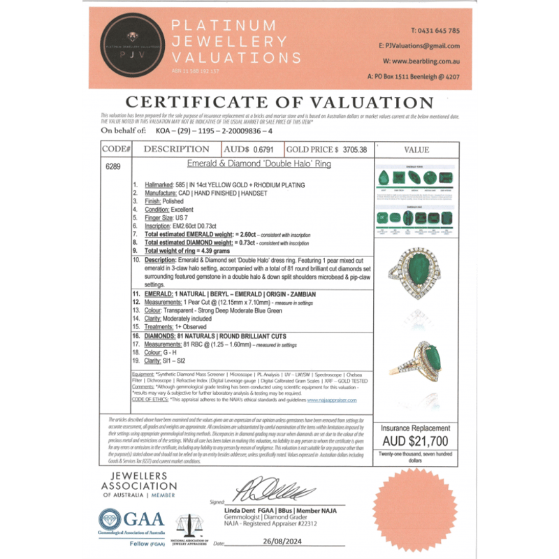 14K YELLOW GOLD, 2.60CT ZAMBIAN EMERALD AND DIAMOND, DOUBLE HALO SPLIT BAND RING. The Centre Features, One Pear Cut, Deep Moderate Bluish-Green, Zambian Emerald (2.60Ct, Moderately Included), 3 Claw Set. Surrounding The Centre In A Double Halo And Decorating The Split Band Are, 81 Round Brilliant Cut, Diamonds (0.73Ct Tdw, G-H Colour, Si1-Si2 Clarity), Micro-Bead/Pip-Claw Set. Ring Size N. 14K Yellow Gold, 2.60Ct Zambian Emerald And Diamond, Double Halo Split Band Ring. The Centre Features, One Pear Cut, Deep Moderate Bluish-Green, Zambian Emerald (2.60Ct, Moderately Included), 3 Claw Set. Surrounding The Centre In A Double Halo And Decorating The Split Band Are, 81 Round Brilliant Cut, Diamonds (0.73Ct Tdw, G-H Colour, Si1-Si2 Clarity), Micro-Bead/Pip-Claw Set. Ring Size N. Valuations Provided by an Independent Third-Party Professional Not Directly Associated With Lloyds Auctions at AUD $$21,700.00This valuation has been conducted by an independent third-party professional. The valuation amount is an assessment by the issuing valuer and does not reflect the auction value of the item. Any inquiries regarding the valuation should be directed to the issuing valuer (refer to contact details on the certificate), as Lloyds Auctions has no affiliation or influence over the valuation, the valuer, or the stated amount. Condition: Good - Refer Images 0645838+5365