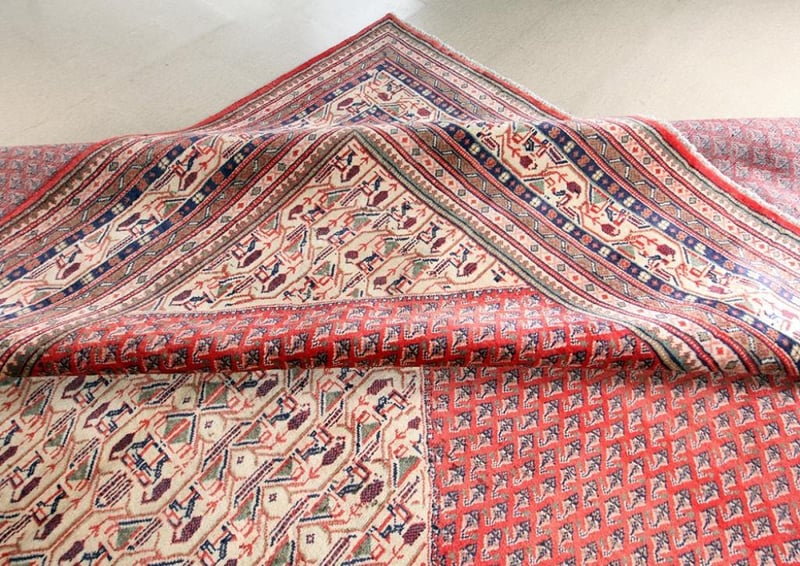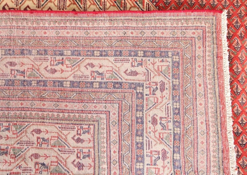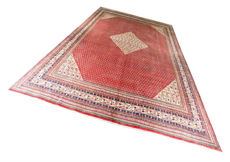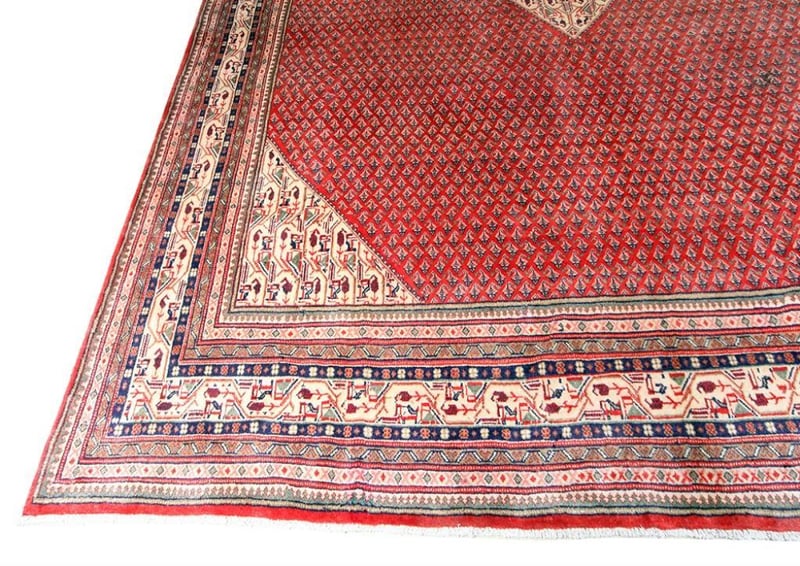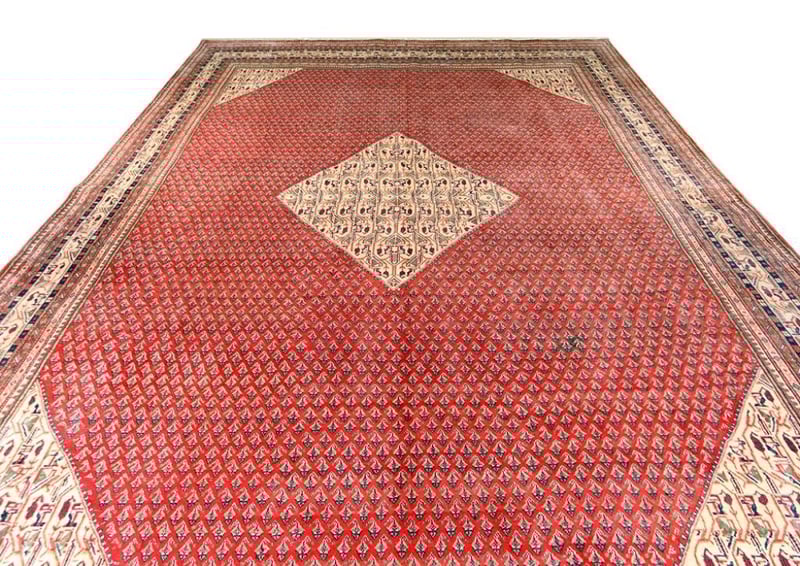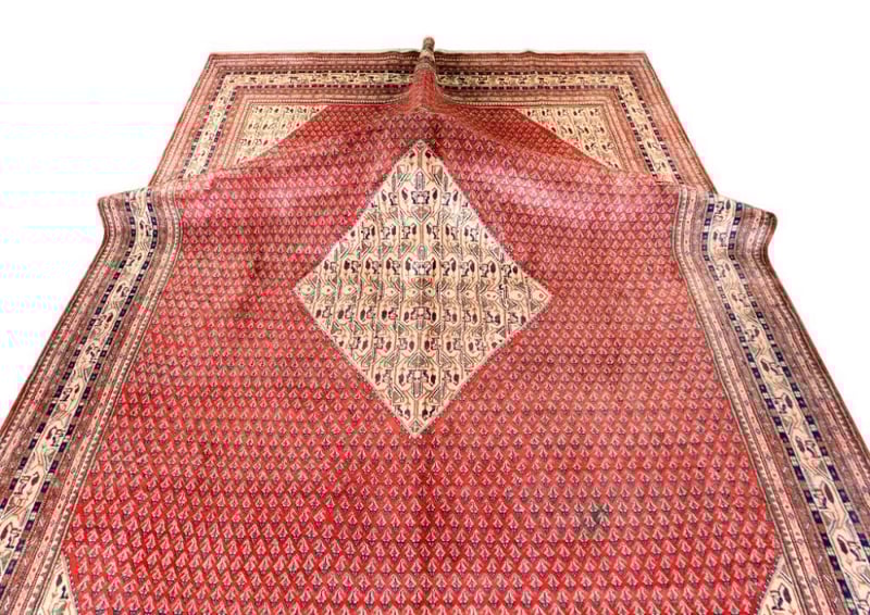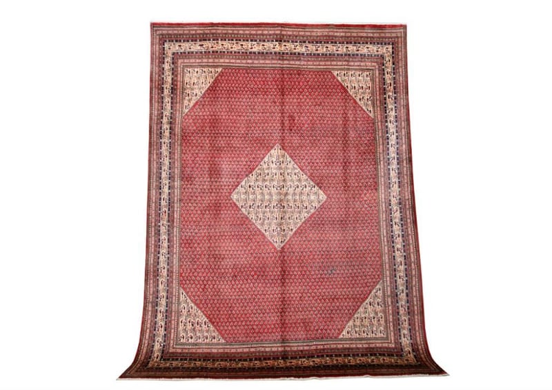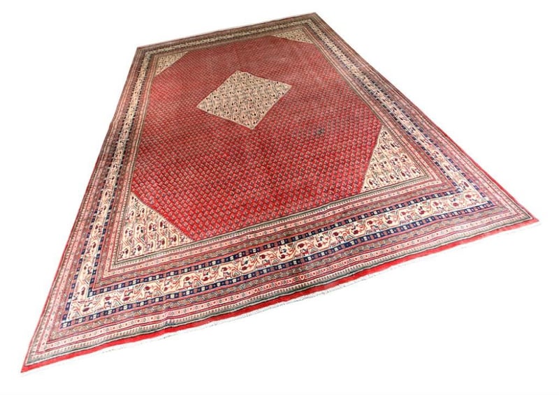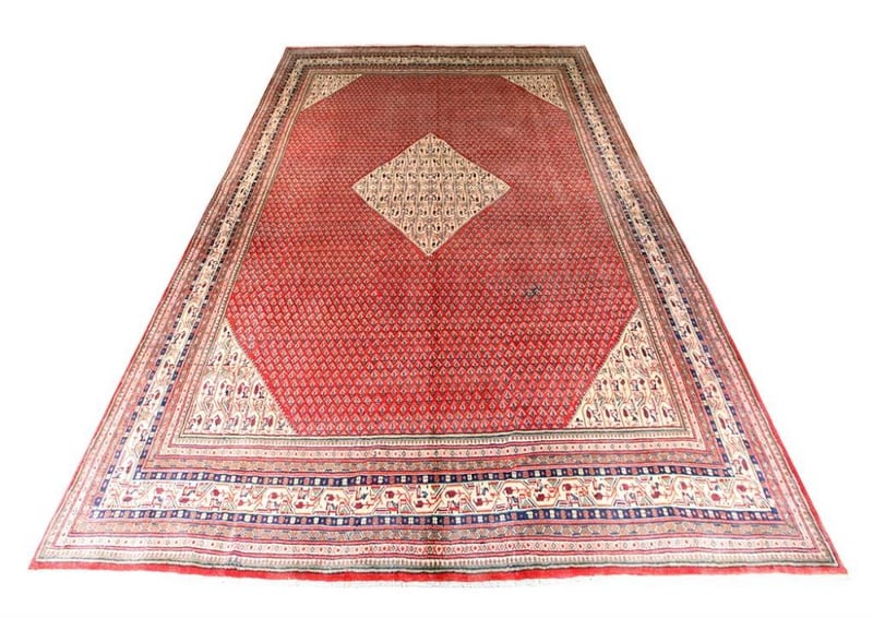 A FINE PERSIAN MARKAZI BOTMIR RUG. Finely Hand Knotted Persian Markazi Botemir . Botemire Design In Red Tone With Diamond Medallion Center And Cream Border. Wool Pile. Rrp:$8990. Circa 1980S. Size: 300 X 400 Condition: Good - Refer To Images 488068+28