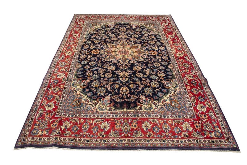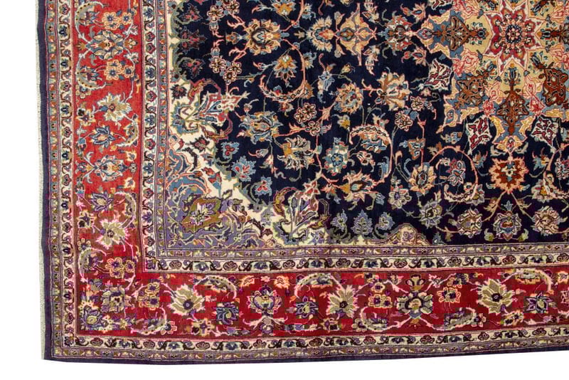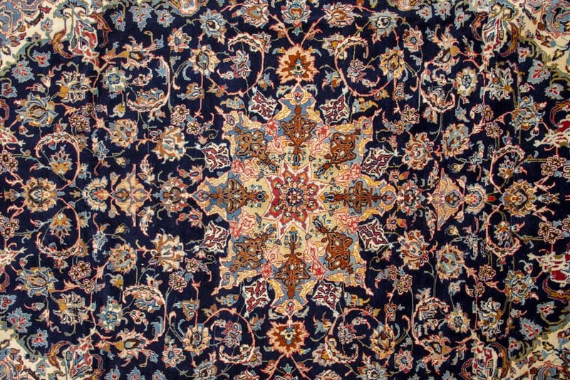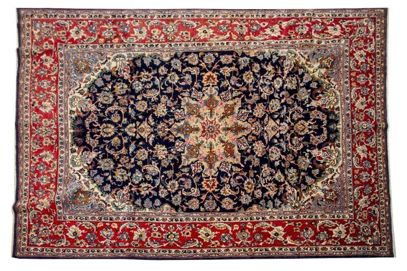 VERY FINE PERSIAN ISFAHAN 55 RAJ CARPET. 100% Lambs Wool Polished Pile, Very Solid And Densely Hand Knotted. In A Traditional Design Of A Central Medallion Shah Abbasi Palmettes In Tones Of Champagne And French Blue. Origin: Persia. Size(Cm): 345X245. Circa 1990S. Rrp: $9480 Condition: Good - Refer To Images 488197+1