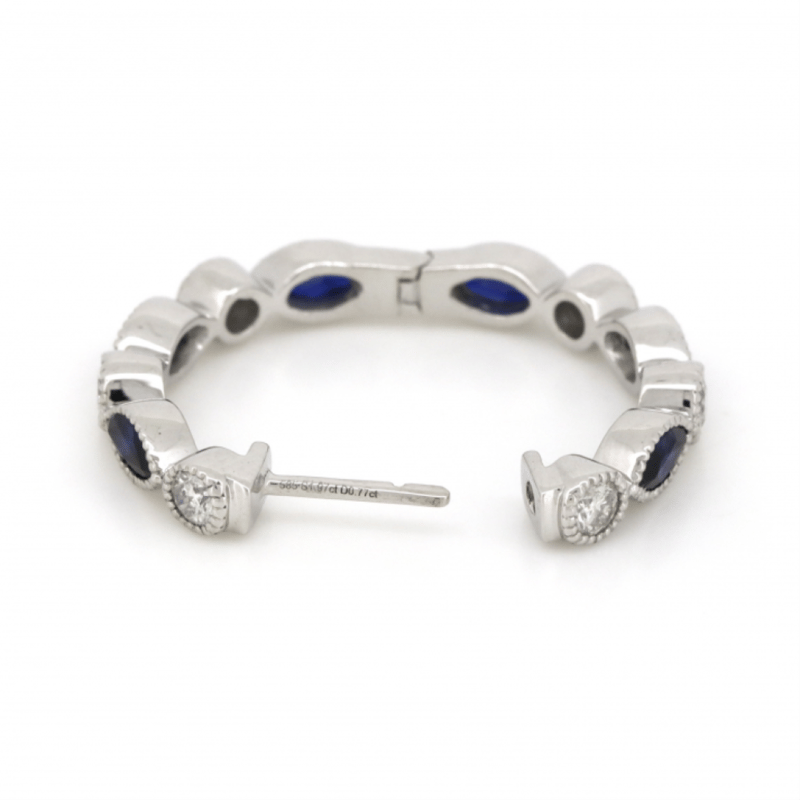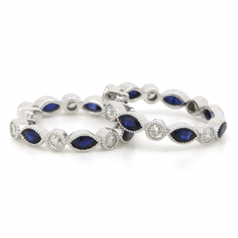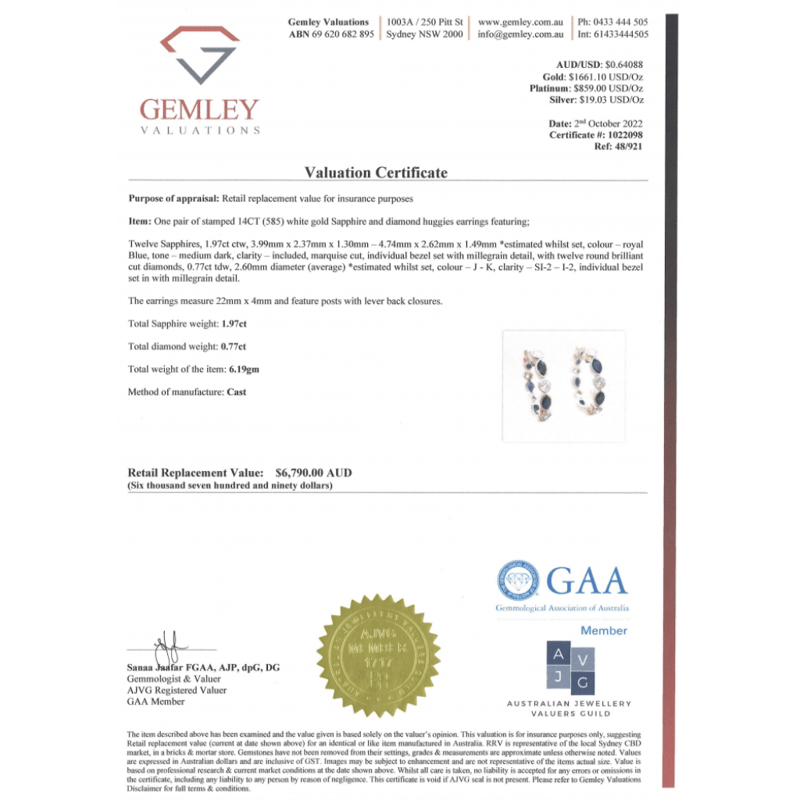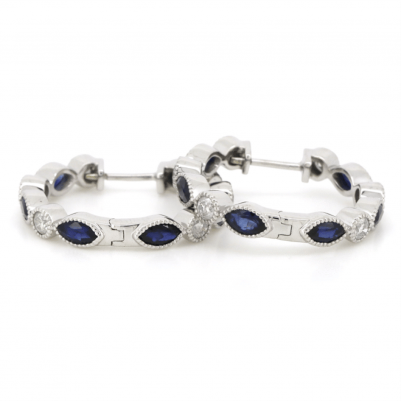14K WHITE GOLD, BLUE SAPPHIRE AND DIAMOND, DECORATIVE HOOP EARRINGS. The Hoops Feature, 12 Marquise Cut, Royal Blue, Sapphires (1.97Ct Tsw, Included), Bezel Set With Millegrain Detail. Alternating With, 12 Round Brilliant Cut, Diamonds (0.77Ct Tdw, J-K Colour, Si2-I2 Clarity), Bezel Set With Millegrain Detail. The Earrings Have Hinged Snap Back Closures. Valuations Provided by an Independent Third-Party Professional Not Directly Associated With Lloyds Auctions at AUD $$6,790.00This valuation has been conducted by an independent third-party professional. The valuation amount is an assessment by the issuing valuer and does not reflect the auction value of the item. Any inquiries regarding the valuation should be directed to the issuing valuer (refer to contact details on the certificate), as Lloyds Auctions has no affiliation or influence over the valuation, the valuer, or the stated amount. Condition: Good - Refer Images 0645845+1587