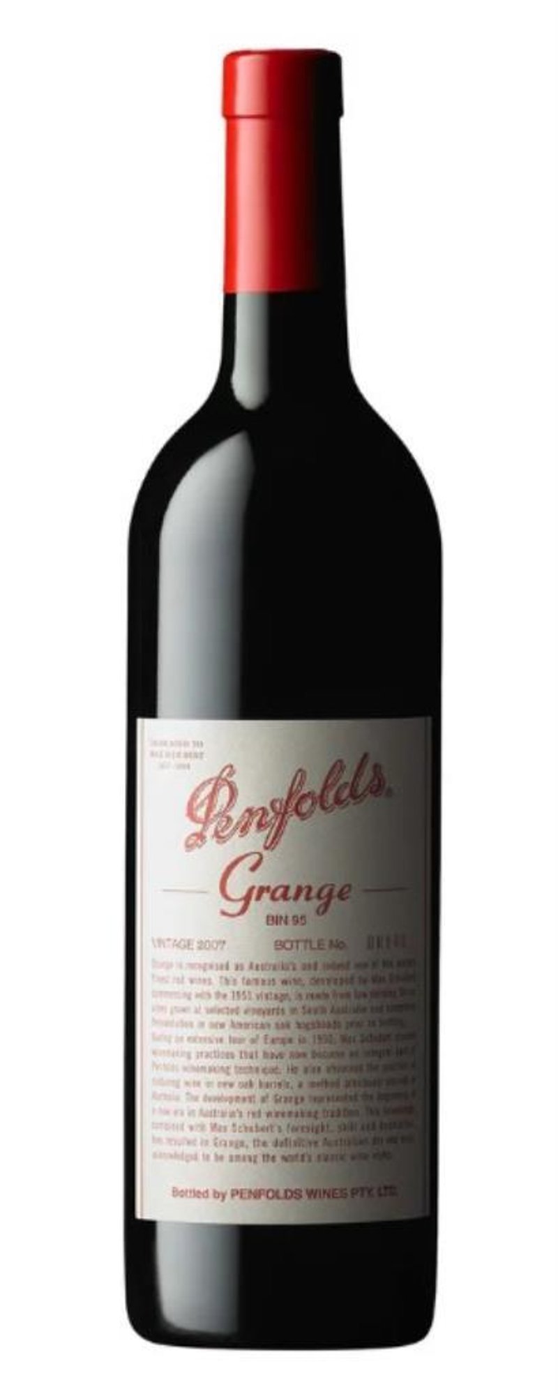 "2007 Penfolds Bin 95 Grange, Deep crimson. Fragrant cedar, herb garden, black cherry and blackberry aromas with mocha, liquorice and grilled nut complexity. Rich, flavourful and sinewy with black cherry, blackberry and cedar flavours, fine-grained al dente textures, an underlying core of sweet fruit and balanced mocha oak complexity. A whack of chalky/gritty tannins at the finish with herb, cola and chinotto notes. Drinking well, but will improve with time. Peak drinking 2025 to 2060. Alc/Vol 14.5%"